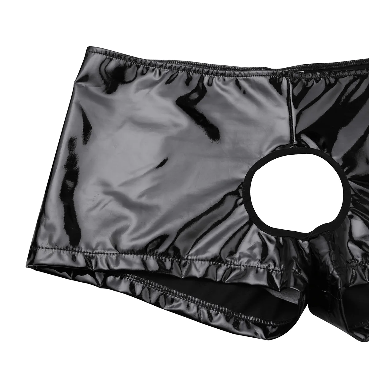 Мужское сексуальное нижнее белье, шорты-боксеры, Порно латексные блестящие шорты из искусственной кожи с отверстием для пениса, с низкой талией для геев, эротические шорты