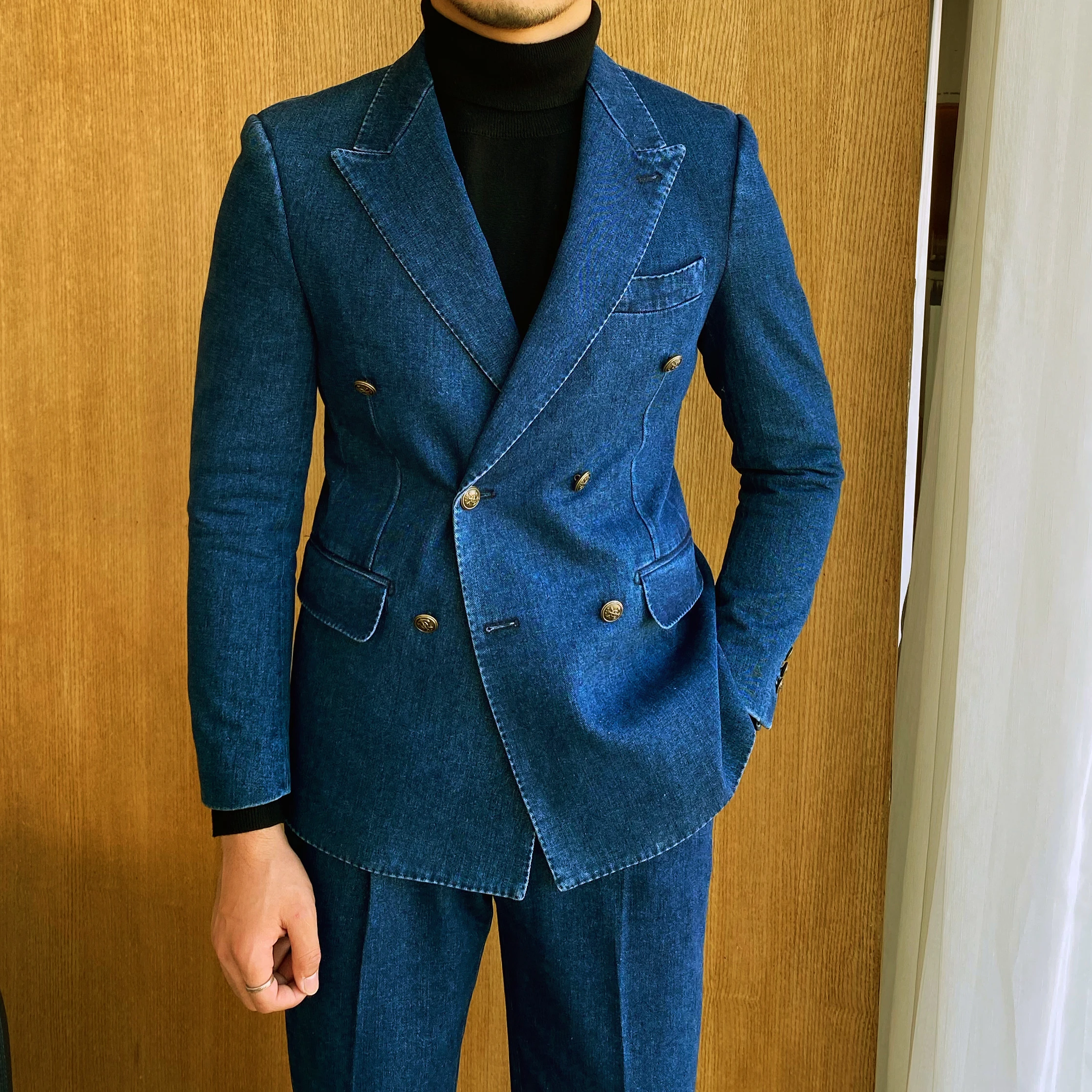 Мужские джинсовые костюмы из ткани Оксфорд, синие костюмы из 2 предметов с заостренными лацканами для свадебных смокингов, Официальный пиджак для курения и шафера + брюки, индивидуальное пальто