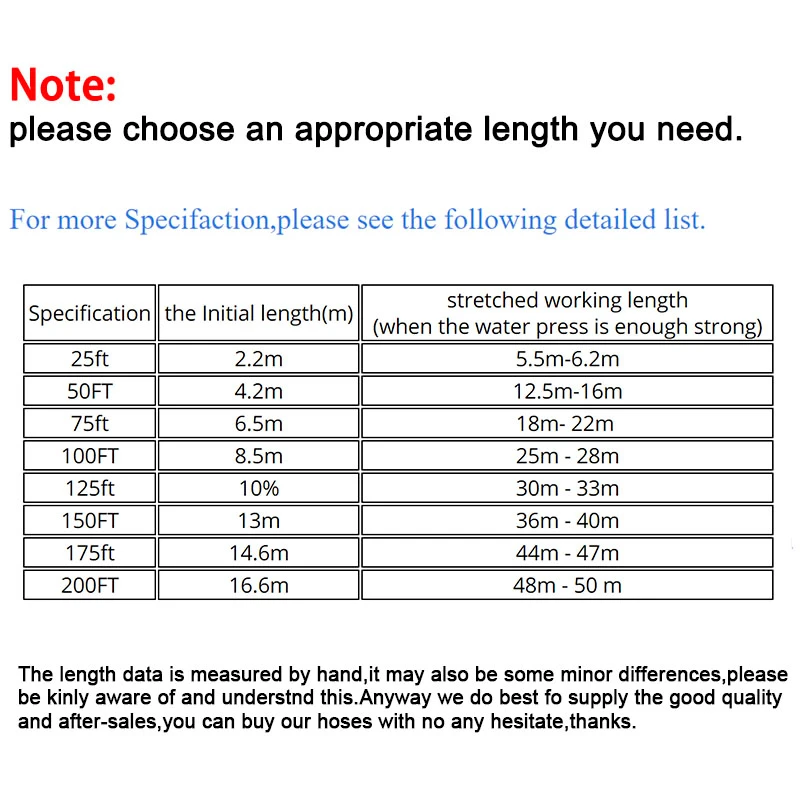 25 футов2,2 м5,5 м-6,2 м50 футов4,2 м12,5 М-16 м75 футов6,5 м18 м-22 м100 футов8,5 м25 м-28 м125 футов10 м30 м-33 м150 футов13 м36 м-40 м175 футов14,6 м44 м-47 м200 футов16,6 м48 м-50 мДанные о длине измеряются вручную, это также может иметь небольшие различия, пожалуйста, имейте в виду и понимаете это. В любом случае, мы делаем все возможное, чтобы обеспечить хорошее качество и послепродажное обслуживание, вы можете без колебаний купить наши шланги, спасибо.