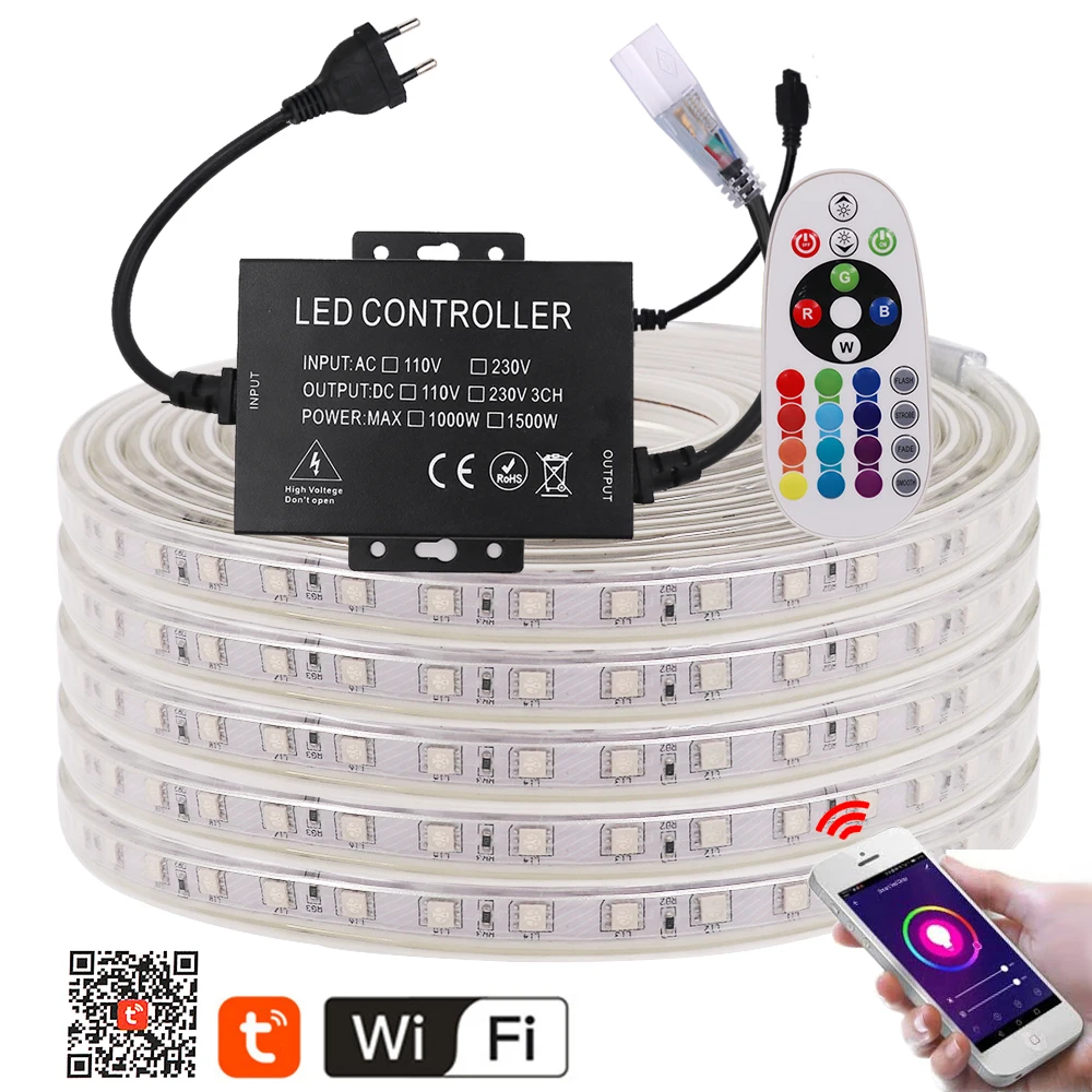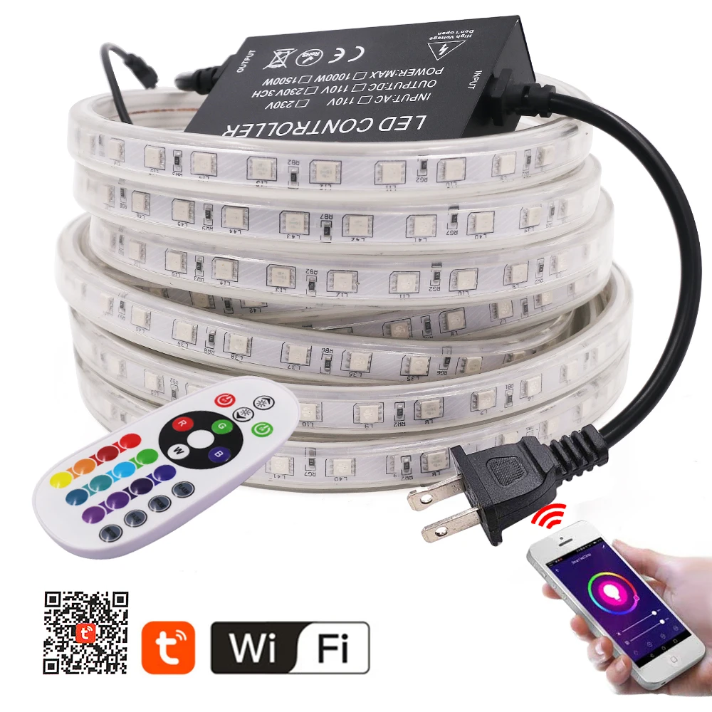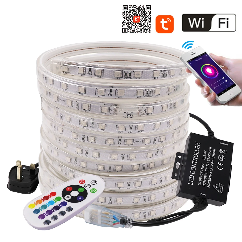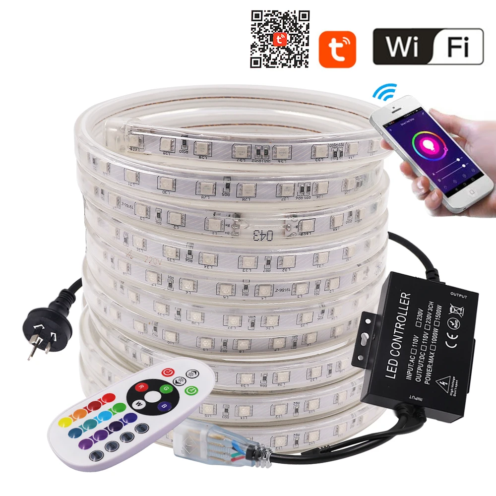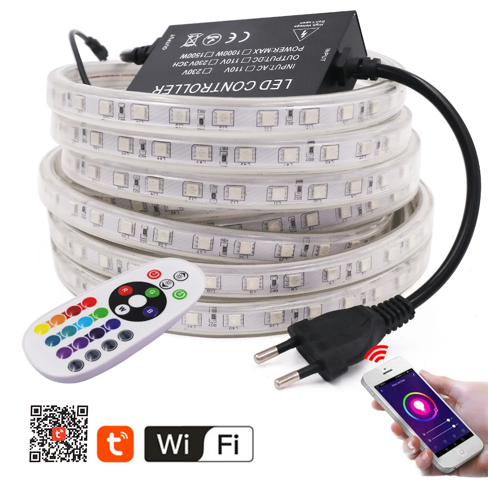 Светодиодная лента с Wi-Fi, 5050, 220 В, RGB + пульт дистанционного управления 24 клавиши, 60 светодиодовм, IP67, водонепроницаемая гибкая светодиодная лента, e, EU, UK, US, AU
