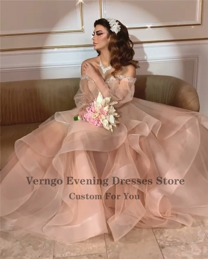 Verngo элегантное розовое платье из органзы, ТРАПЕЦИЕВИДНОЕ платье для выпускного вечера с пышными длинными рукавами и бусинами, с открытыми плечами и оборками, 2021