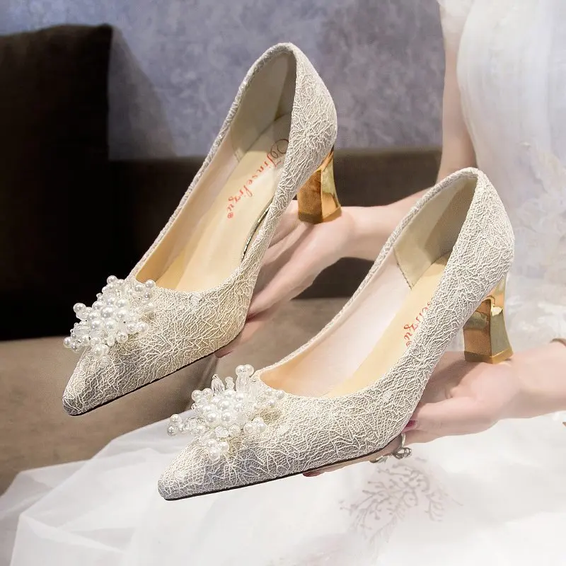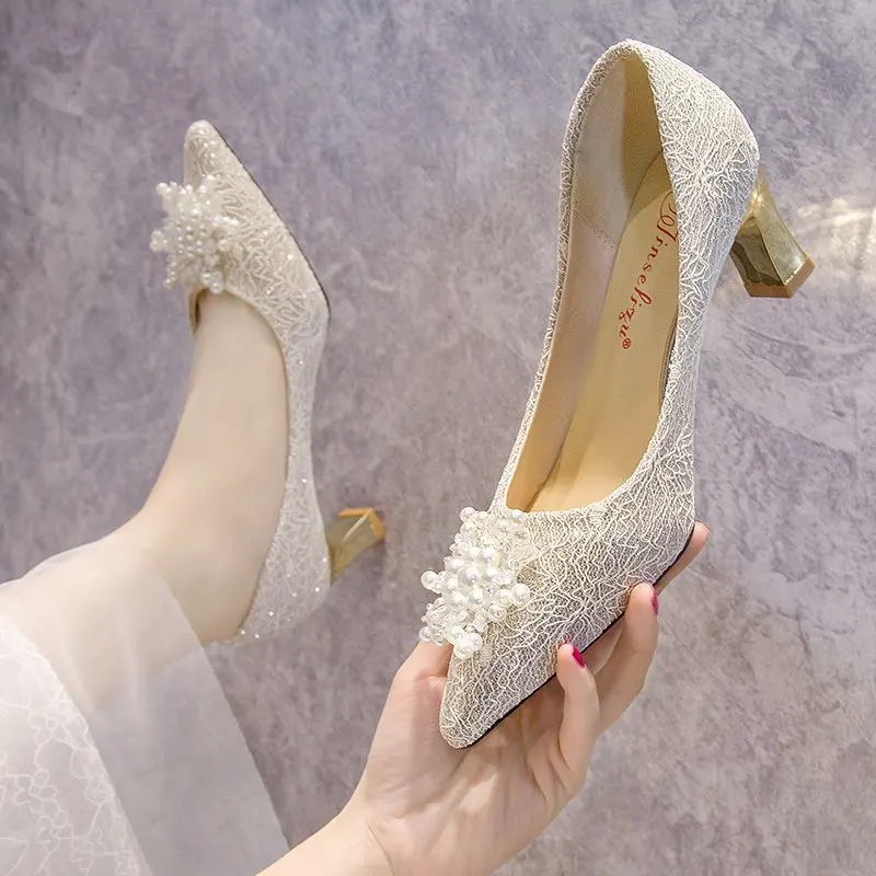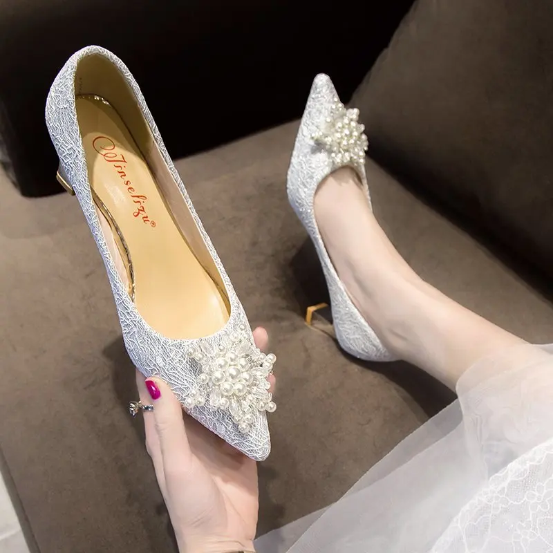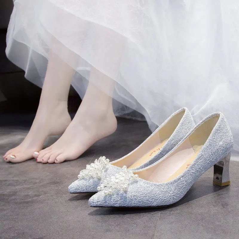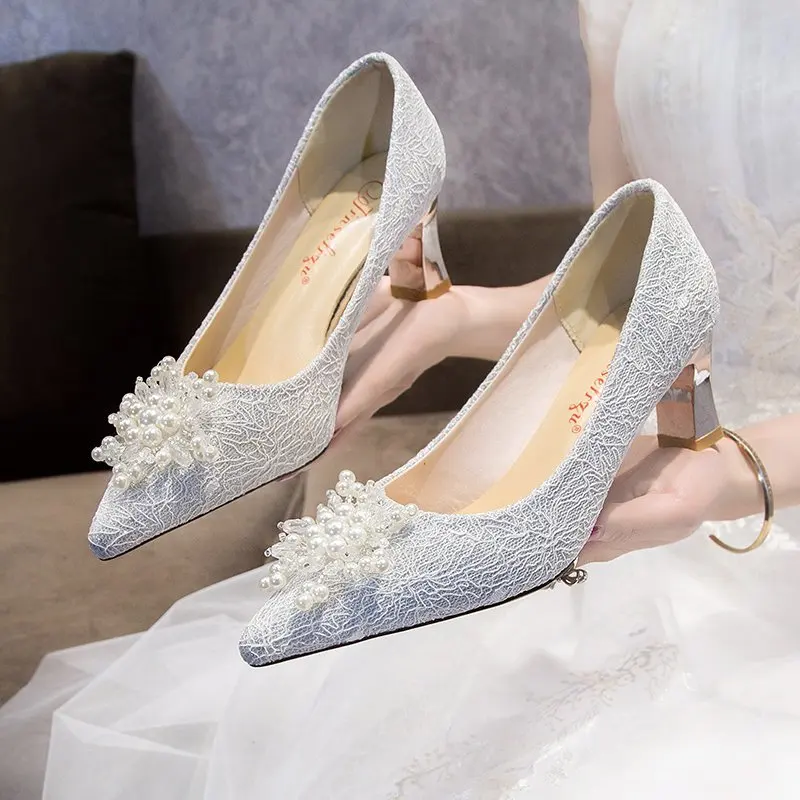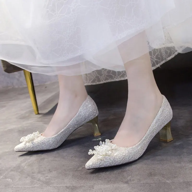 2021 новые пикантные элегантные свадебные туфли женские туфли-лодочки Модные Серебристые туфли на высоком квадратном каблуке с острым носком и бисером