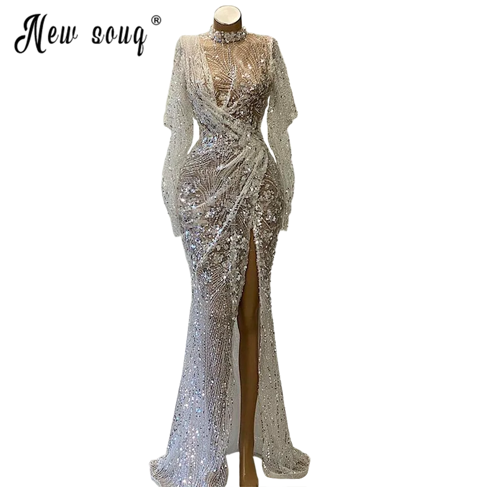 Цвета слоновой кости Дубай Высокая шея сексуальные Сплит Сторона вечерние платья роскошное бисер Кристалл блестящее формальное платье 2021 Serene vestido de festa