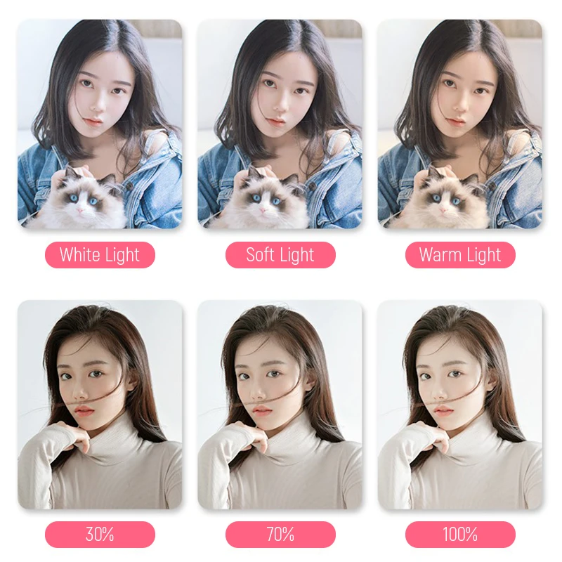 Fearues: 1. Выходная мощность: 12 Вт2. Длина линии 1,5 м3. Зажим для телефона подходит для 6-10 см;4. Режим питания: источник питания USB5,26 см заполняющий светильник: шлейф: 26x26 см внутренний диаметр: 19x19 см6. Регулировка яркости: трехцветный Регулируемый 10-скоростной светильник Упаковка включает: заполняющая лампа * 1 + мобильный телефон кронштейн * 1