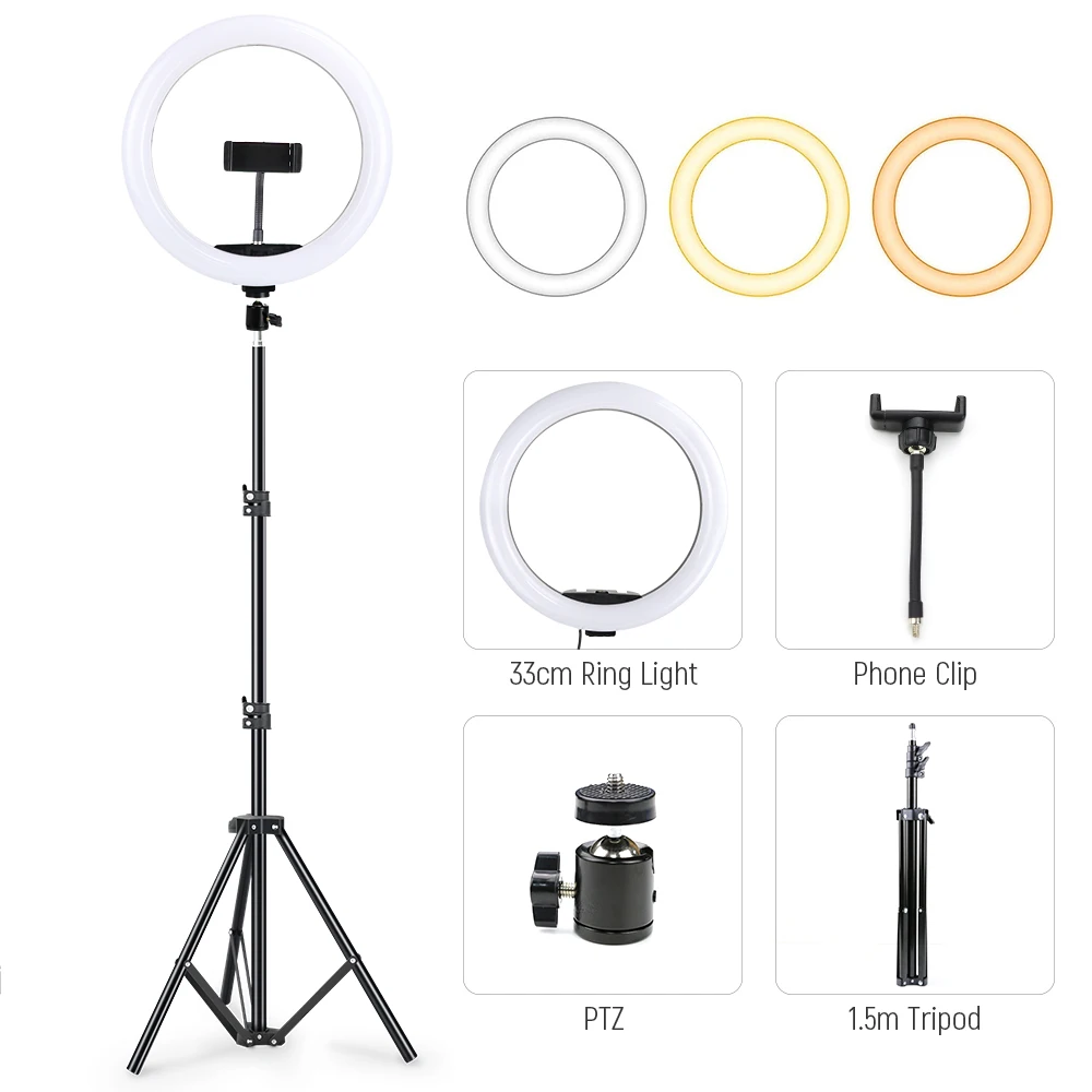 Спецификация:Внешний диаметр: 33 смВнутренний диаметр: 25 смЦветовая температура/Теплый светильник: 2800-3200KЦветовая температура/белый светильник: 4800-5200KКоличество лампочек: 168 бусинCRI: 80Режим питания: интерфейс USBНапряжение: 2,9-3,0 VСветильник Мощность: 11 ВтМатериал: АБС-пластикПосылка:Кольцевой светильник 1x33 см1x1,5 м штатив-Трипод