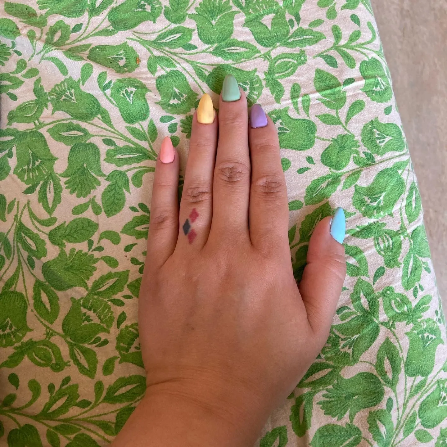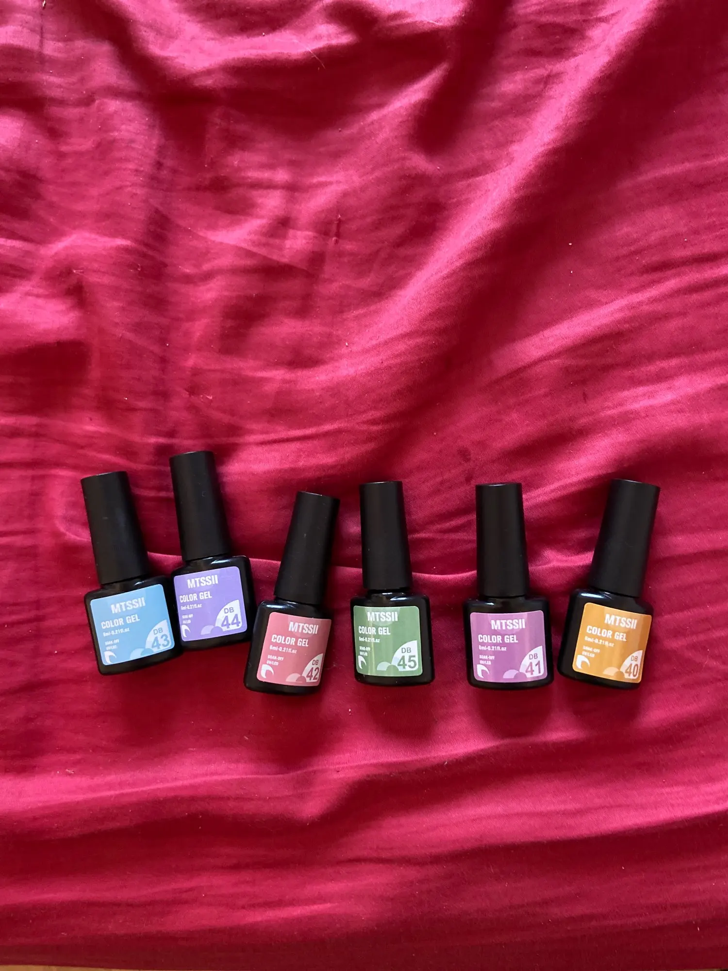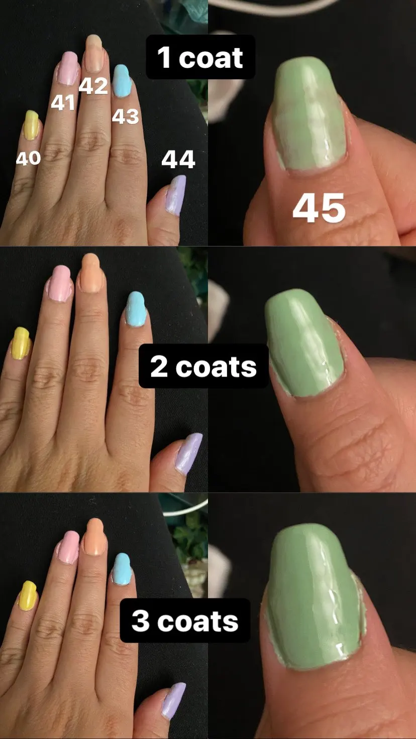 The bottles are small but enough for me since I don’t paint my nails a lot and I already own a lot of nail polish. They are 6mL or 0.21 fl. oz. each The orange color 42 was very thin and definitely needs at least 3 coats to be opaque. The rest were lovely. My favorite was blue 43, it was the most opaque. This was my first time using gel polish so I painted them badly. I used 3 coats of the polish and the last photos are with a top coat. My left hand has many bumps and bubbles but I think that is my own fault. I definitely recommend these for beginners who want to try out gel polish! They seem like very good quality. These colors are lovely for springtime.