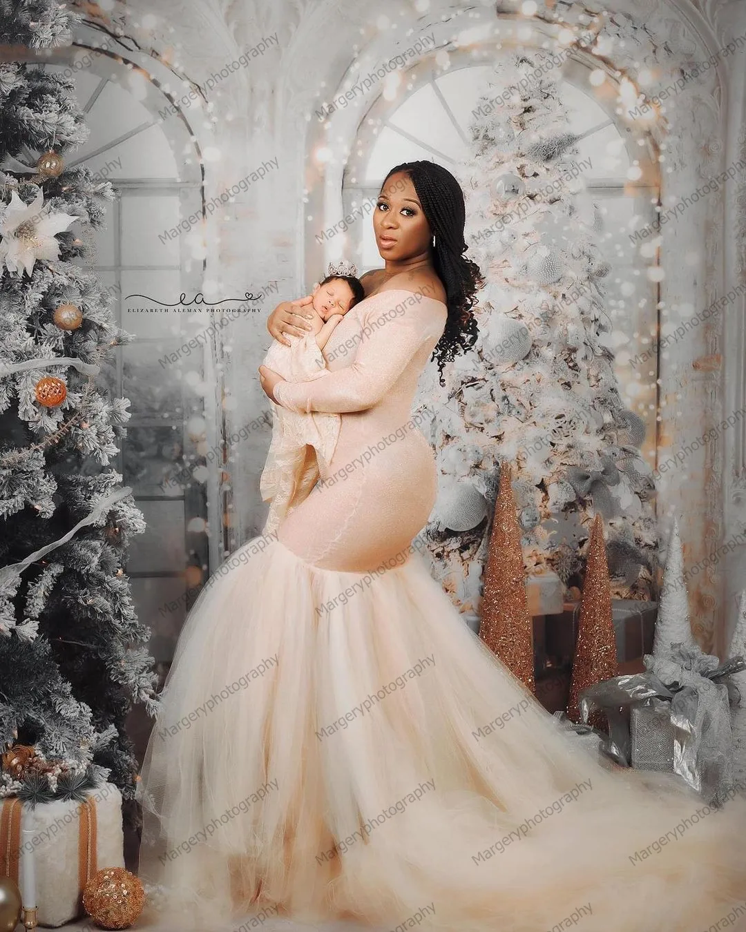 Элегантное бежевое платье с открытыми плечами Тюль Русалка для беременных женское платье в пол Длина красивое Пышное с оборками Беременность Платье для фотосессии