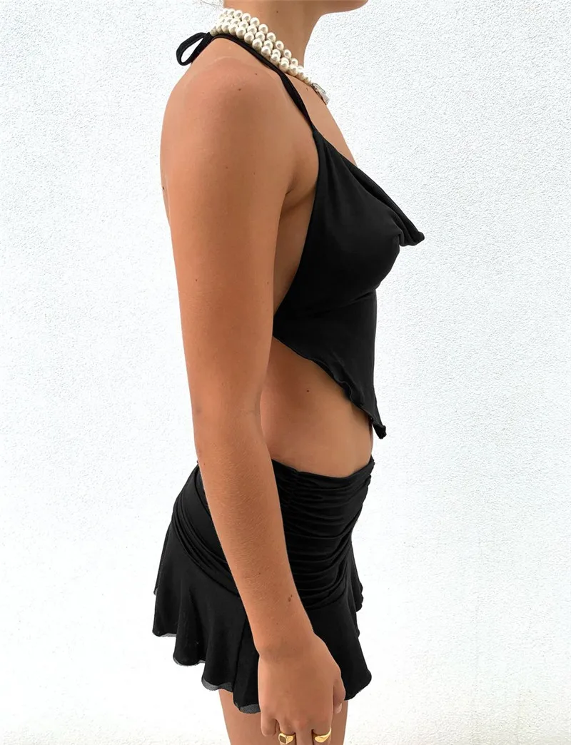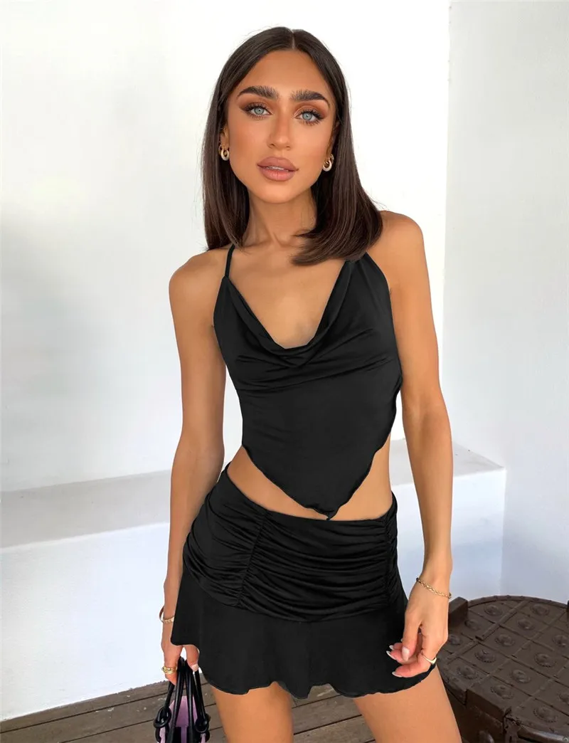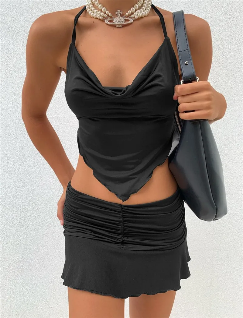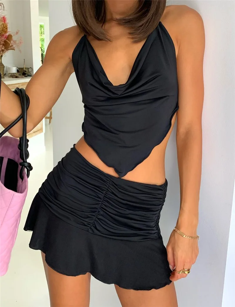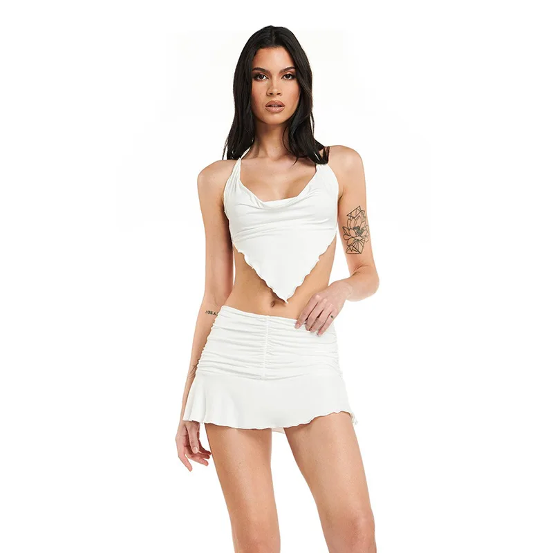Комплект для ночного клуба BOOFEENAA, летний комплект из 2 предметов, белый короткий топ с лямкой на шее и мини-юбка, модель C83BE17, женские костюмы