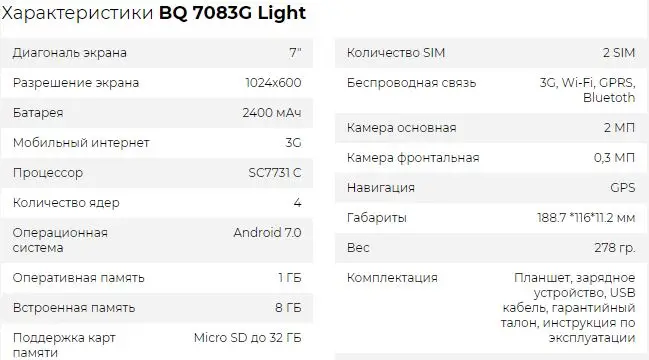 Планшет оснащен четырехъядерным процессор SC7731. Оперативная память 1 ГБ и встроенная 8 ГБ обеспечивают высокую скорость работы устройства даже при одновременном открытии нескольких программ и загрузке новейших приложений.