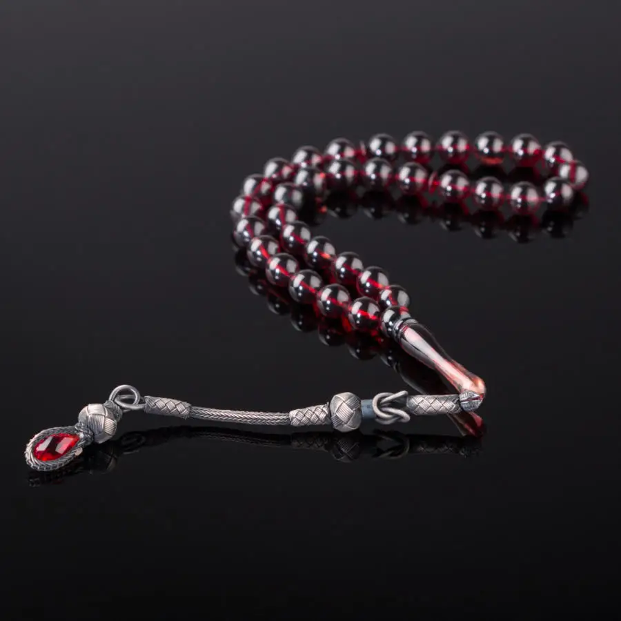 Серебряный бордовый красный янтарный камень Молитвенные Четки мужской Розарий со звездами и серебряной кисточкой, исламский тасбих с кисточкой-каплей