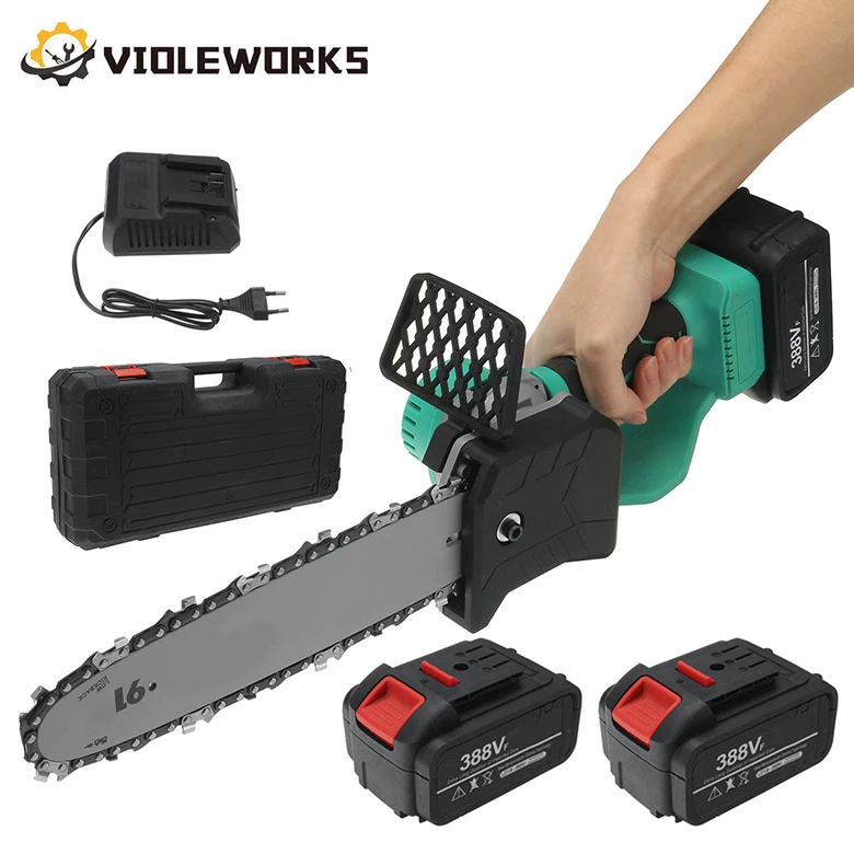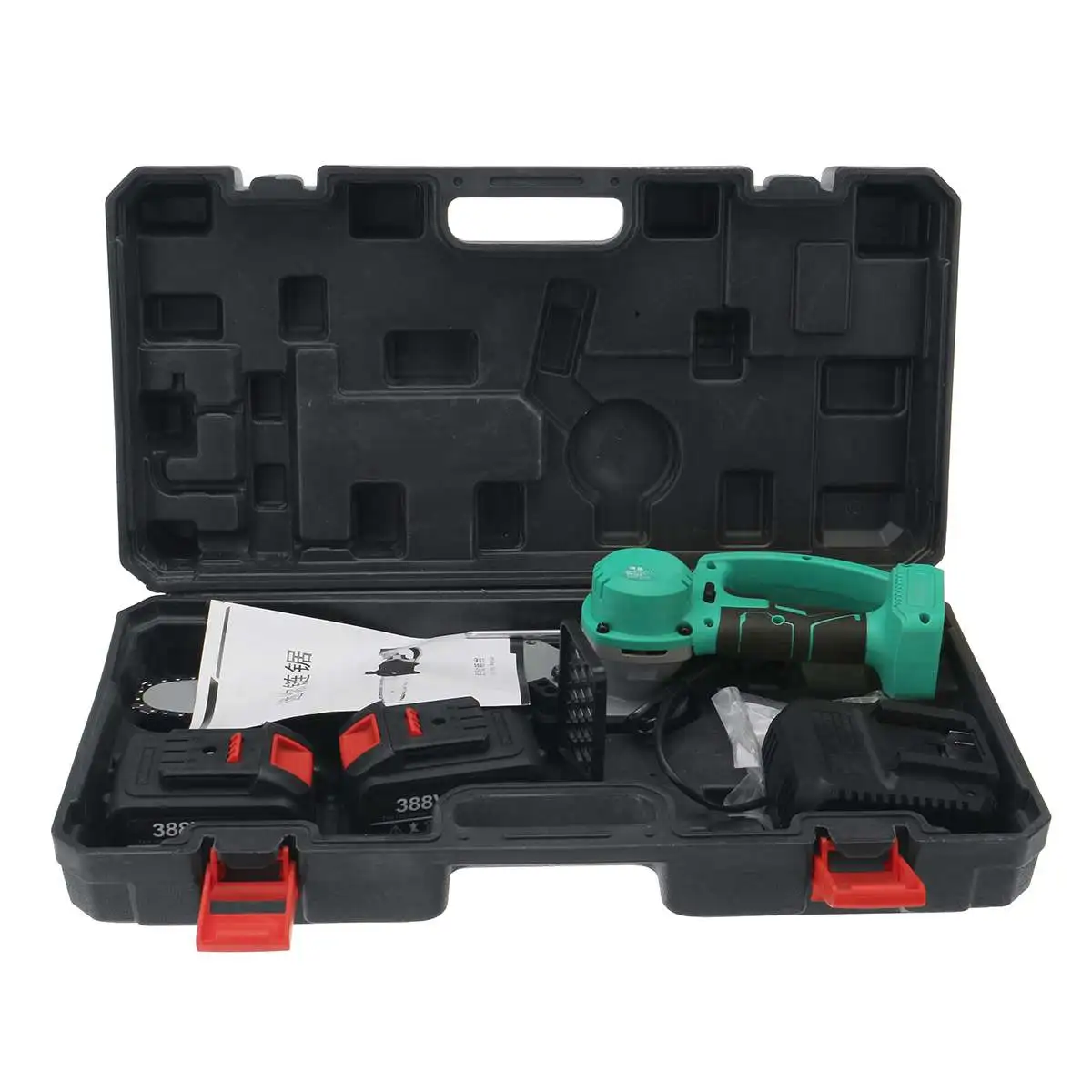 388VF электрическая Беспроводная цепная пила для деревообработки с аккумуляторомСпецификация:Номинальная входная мощность: 2500 ВтСкорость цепи: 10 м/сНоминальное напряжение: 388VFДлина направляющей пластины: 25,4 см/10 дюймовМаксимальная толщина резки: >20 см/7,87 дюймаСкорость холостого хода: 8800 (об/мин)Тип питания: технология перезаряжаемого литиевого аккумулятора