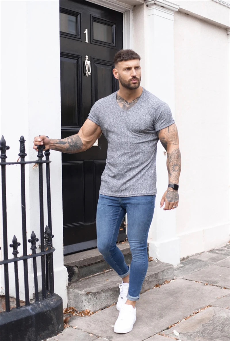 Футболка мужская Трикотажная с V-образным вырезом, облегающая спортивная рубашка для бега, бодибилдинга, фитнеса и воркаута