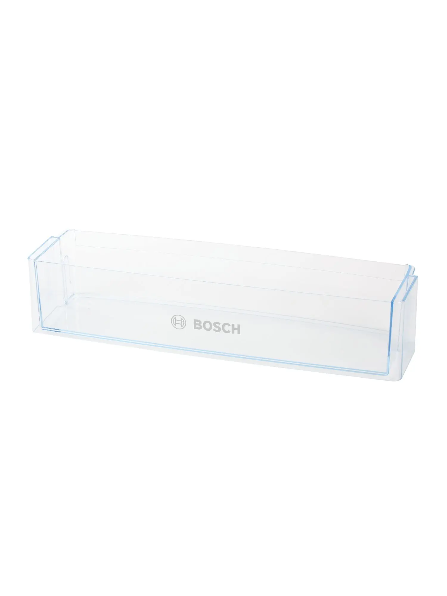 Полка на дверцу холодильной камеры для холодильника, нижняяПластиковая, прозрачная, с логотипом BoschПолка для дверцы холодильника Bosch используется в моделях серии KGE36.., KGE39.., KGS36.., KGS39.., KGV36.., KGV39..Перед заказом, пожалуйста, проверяйте совместимость с Вашим прибором
