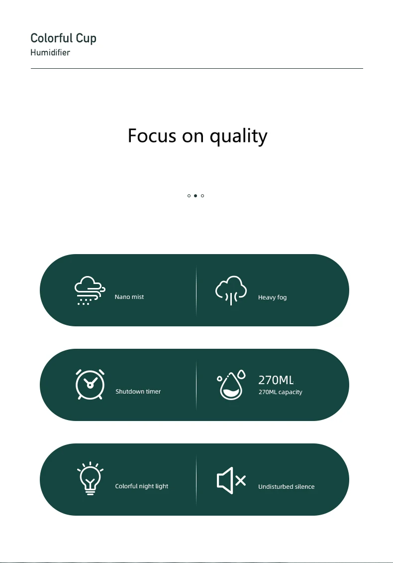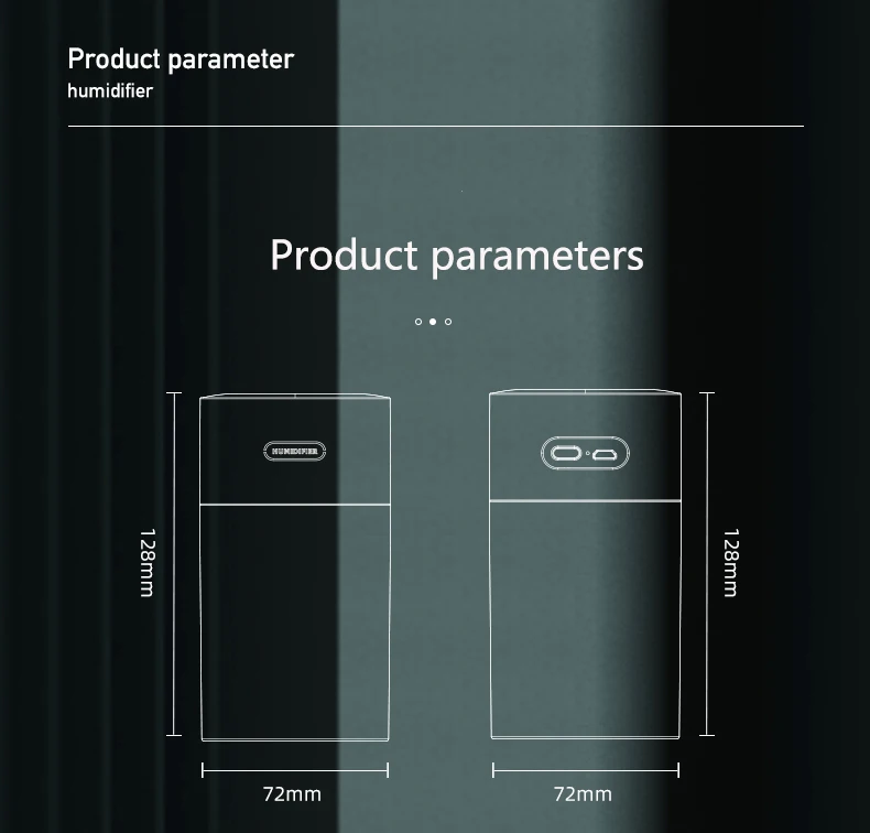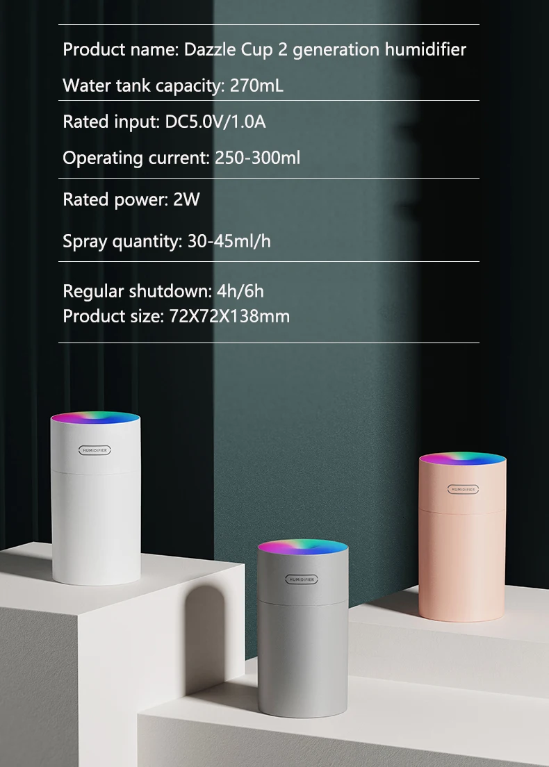 Название продукта: ослепляющий увлажнитель второго поколенияЕмкость резервуара для воды: 270 млНоминальный вход: DC5.0V/1.0AРабочий ток: 250-300 млНоминальная мощность: 2 ВтКоличество распыления: 30-45 мл/чРегулярное отключение: 4h/6hРазмер изделия: 72x72x138мм