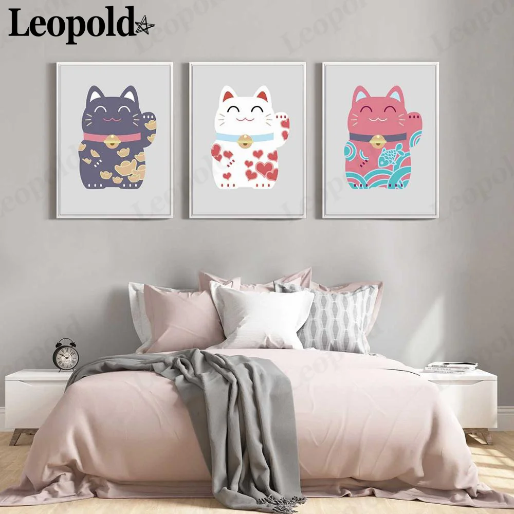 Современный Милый Постер на холсте с животными, розовый, белый, кот удачи, живопись, настенное искусство, нордическая комната, украшение для дома, Безрамная живопись