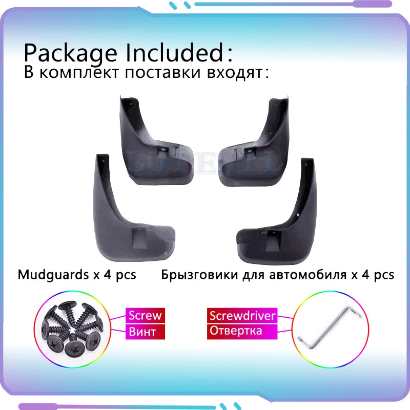 4 x брызговика, 1 x отвертка, сумка для фиксации винтов