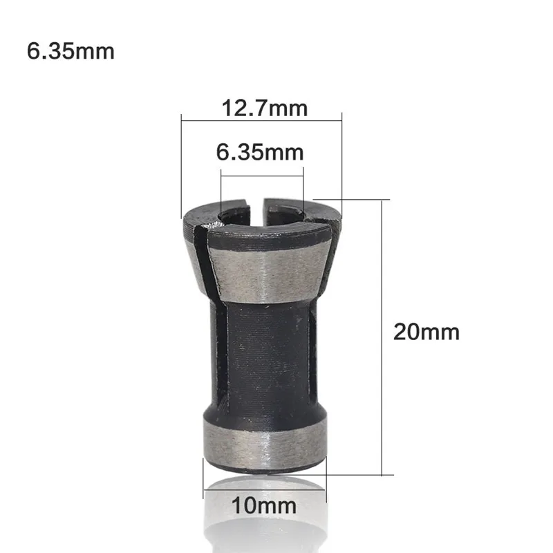 Технические характеристики: цанговый патрон, гравировальный станок, Электрический фрезерный станок, большой диаметр головки снаружи: 12,35 мм, 12 мм, маленький внешний диаметр головки: 10 мм, 10 мм, диаметр отверстия: 6,35 мм (1/4 дюйма) ,8 мм превышение длины: 20 мм, 16,5 мм