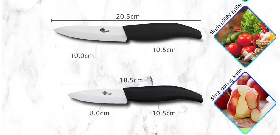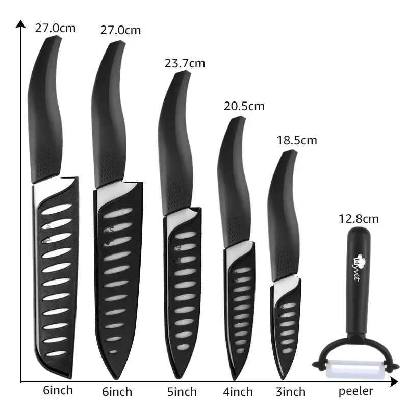 Керамические ножи должны использоваться только на деревянных, пластиковых или бамбуковых разделочных досках. Использование этих ножей на стекле, мраморе или плитке может привести к тому, что лезвия будут чипеть или сломаться. Эти ножи идеально подходят для резки фруктов, овощей и мяса без костей. Не используйте эти ножи для резьбы, склеивания или подделки. Это может повредить ножи.