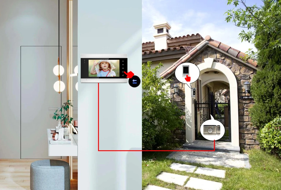 Поддержка подключения функции задержки электронный замок к этой системе. С помощью этой функции вам просто нужно нажать кнопку разблокировки на мониторе. Поддержка регулировки времени между блокировкой и разблокировкой. Таким образом, это делает ваш дом более безопасным.