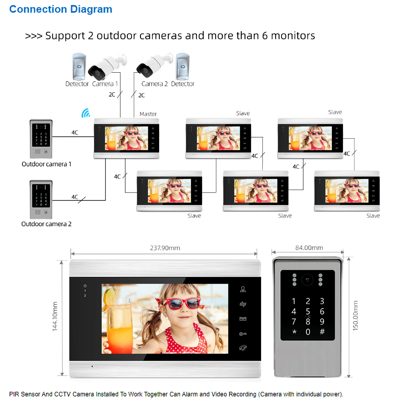 Максимальная поддержка подключения с 2 наружными панелями вызова + аналоговые 2 камеры (или PIR детекторы) + 6 мониторов в одной системе. PIR датчик и CCTV камера, установленная для работы вместе, может сигнализация и запись видео (камера с индивидуальным powe