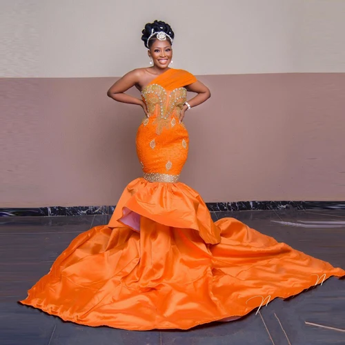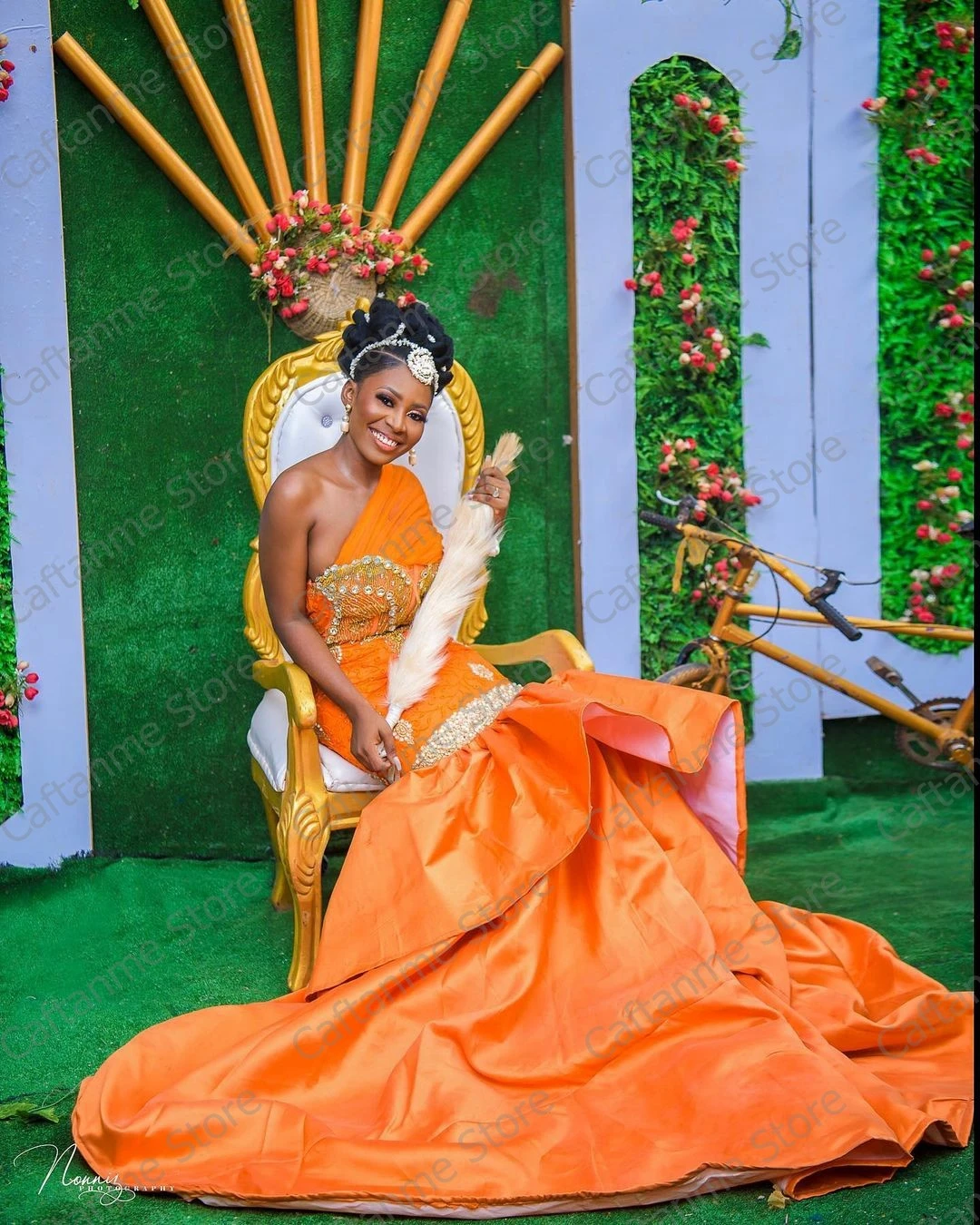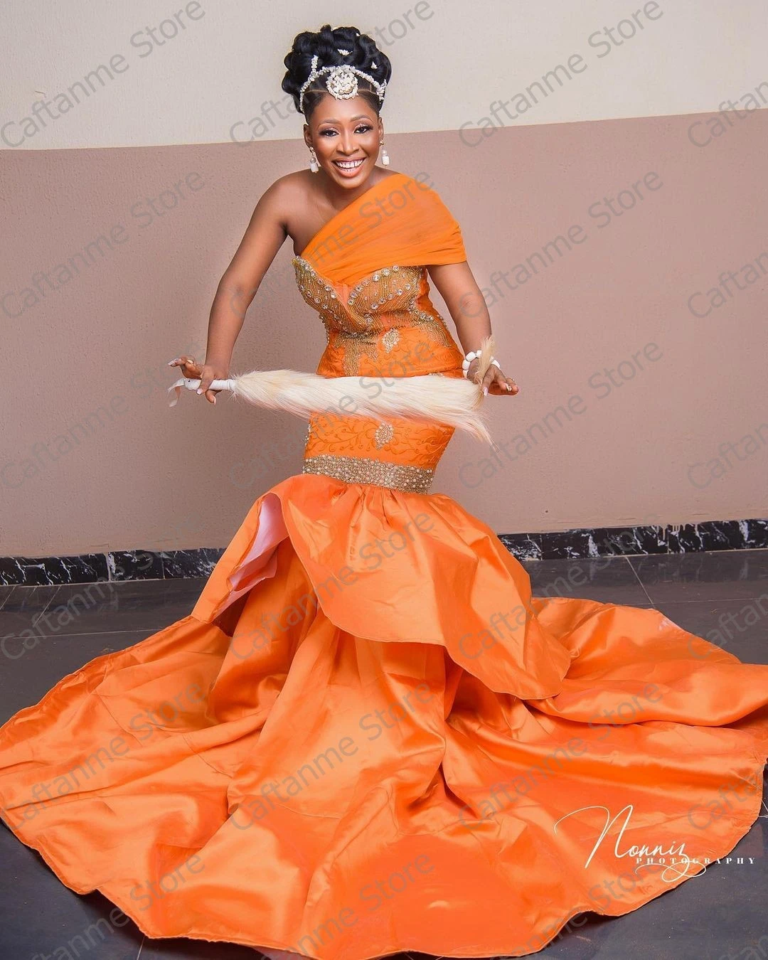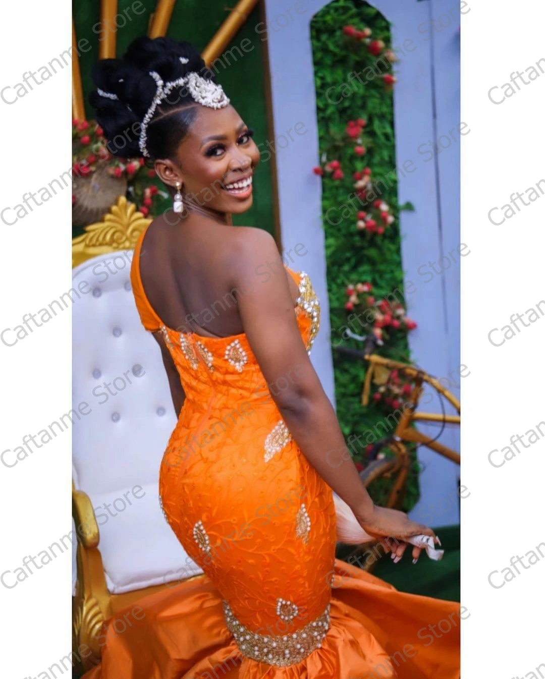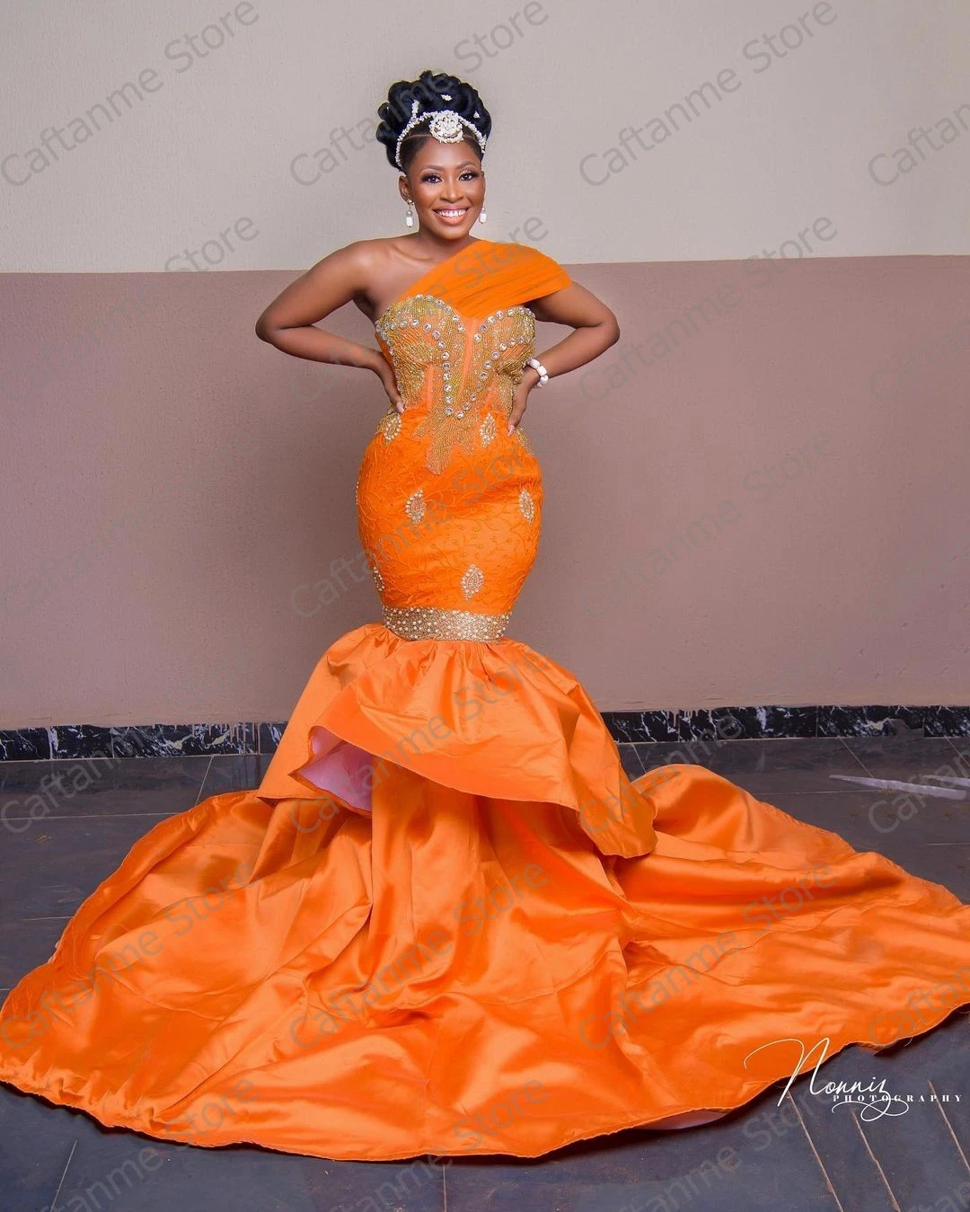 Шикарный оранжевый атласные длинные в стиле русалки вечерние платья 2021 элегантное платье на одно плечо с блестящими стразами и бисером для вечерние выделка женская обувь по индивидуальному заказу
