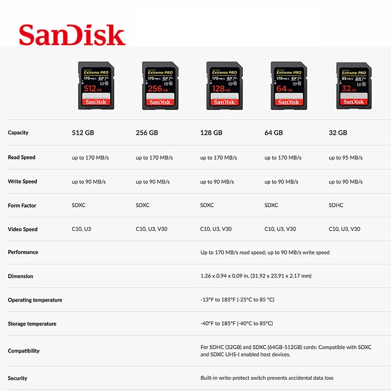 Карта памяти SanDisk Extreme PRO, высокоскоростная карта памяти SDHC UHS-I, 1 ТБ, 256 ГБ, 128 ГБ, 64 ГБ, 32 ГБ, флэш-карты памяти