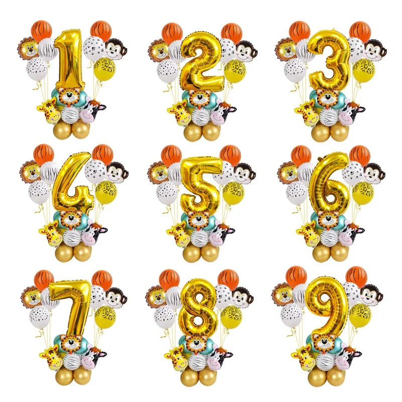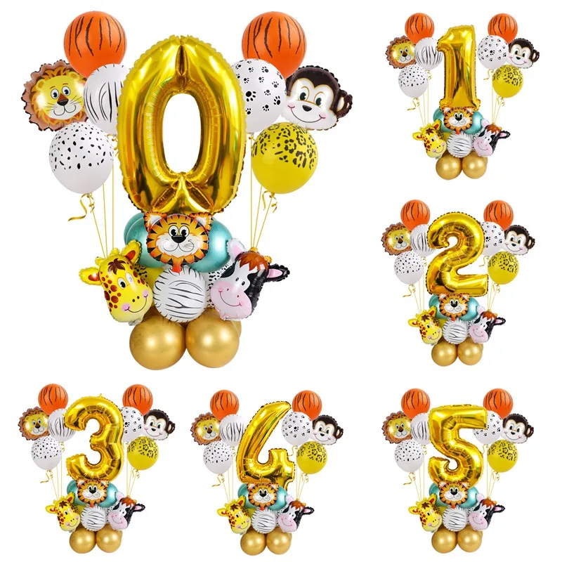 Воздушные шары с животными в лесу и джунглях, золотые цифры, сафари...