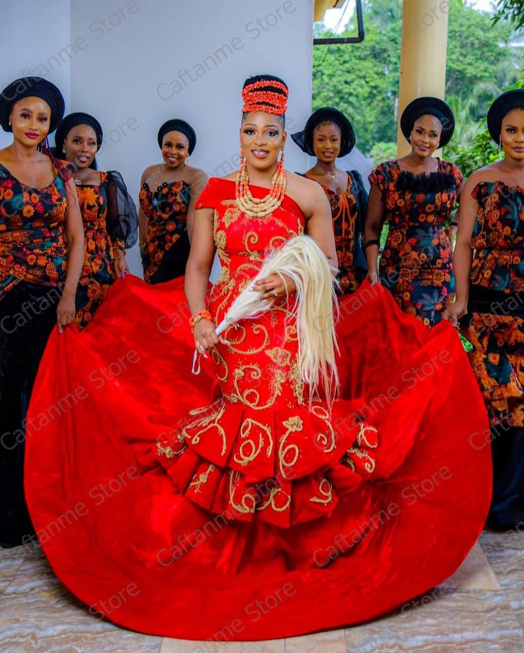 Красное Свадебное атласное платье с золотыми бусинами Aso Ebi, вечерние платья на одно плечо, Длинные вечерние платья для женщин с многоярусными оборками и шлейфом