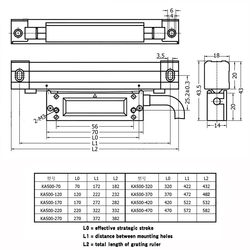 KA-500-Мини-энкодер, специально разработанный для станка с низким уровнем Установочный размер и небольшое рабочее пространство. Он может удовлетворить потребности этих клиентов У кого есть требования к должности. Длина 70 ~ 470 мм 1. Технические параметры 1,1, шаг: 0,02 мм (50 линий/мм) 1,2, разрешение: 5 мкм, 1 мкм, 0.5мкм 1,3, Точность: + 3 мкм + 5 мкм + 15 мкм м/м (20 + 0,1 C) 1,4, диапазон: 30-470 мм 1,5, скорость перемещения: обычная линейка 60 м/мин 1,6, Питание: + 5V + 5%, 80mA 1,7, длина кабеля: Стандартная 3 м (специальная длина может обеспечить в соответствии с потребностями пользователя) 1,8, Рабочая температура: 0 ~ 45