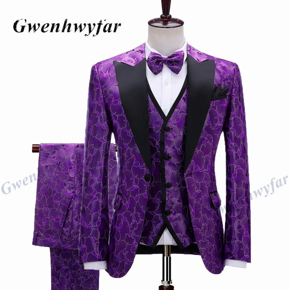 Гвенвифар и остроконечными лацканами Slim Fit фиолетовый жаккард смокинг жениха ужин вечерние костюм Для мужчин 3 предмета свадебное платье друга жениха, костюм