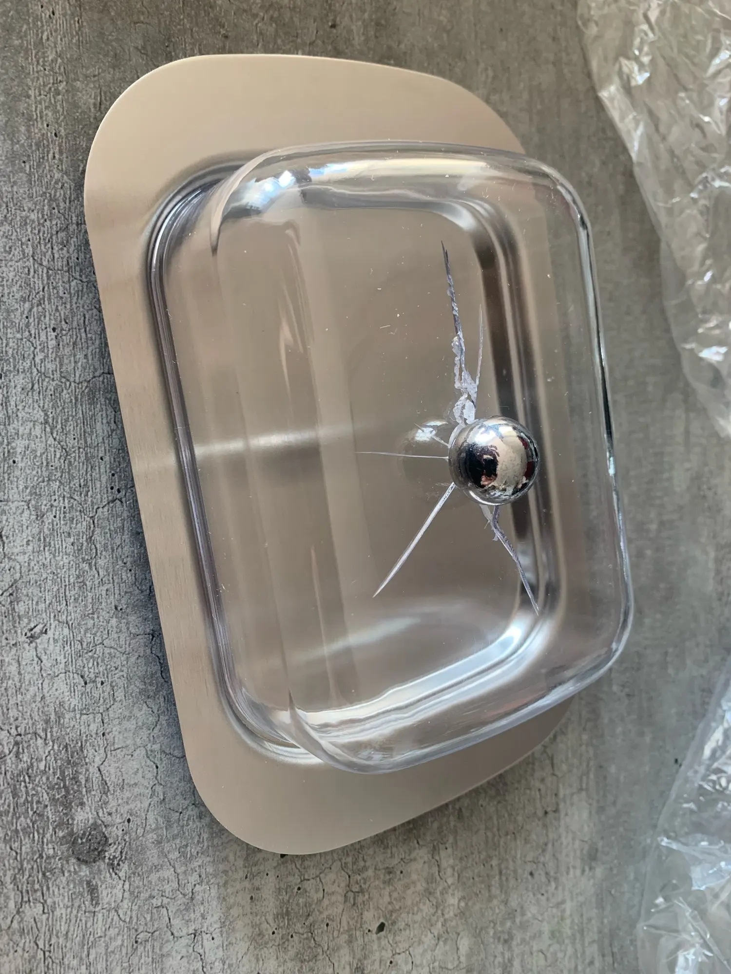 Четыре заказа объединили в одну посылку, что очень хорошо. Доставка задержалась на неделю. Коробка, в которой пришла посылка, оказалась вся мятой, ощущение, что ей играли в футбол. В коробке было все целое, кроме масленки. Крышечка оказалась раздавленной. На ней железный шарик, за который держаться, оказался вдавленным в крышечку. Мне очень жаль! Я так хотела такую масленку! Буду писать продавцу, пусть высылает другую крышку, денег мне не надо. Не знаю, чья тут вина, продавец плохо упаковал или доставка такая. Звезды не снимаю, продавец все свои обещания выполнил.