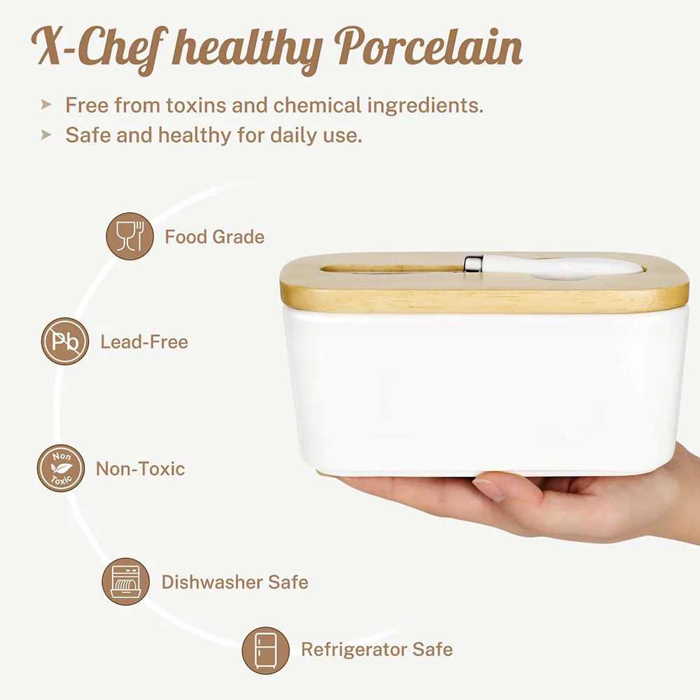 Контейнер для масла изготовлен из здоровой керамики, крышка из дуба, нож для масла изготовлен из нержавеющей стали 304. Все материалы безопасны, безопасны для здоровья и относятся к пищевым продуктам.