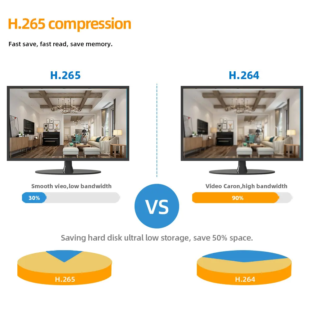 Более четкое H.265, HD разрешение обеспечивает наилучшее качество изображения при более низкой скорости передачи данных.Сэкономьте больше места для хранения, вы можете уменьшить размер файла на 40%-50%,Сэкономьте место на жестком диске и снимите стоимость покупки.