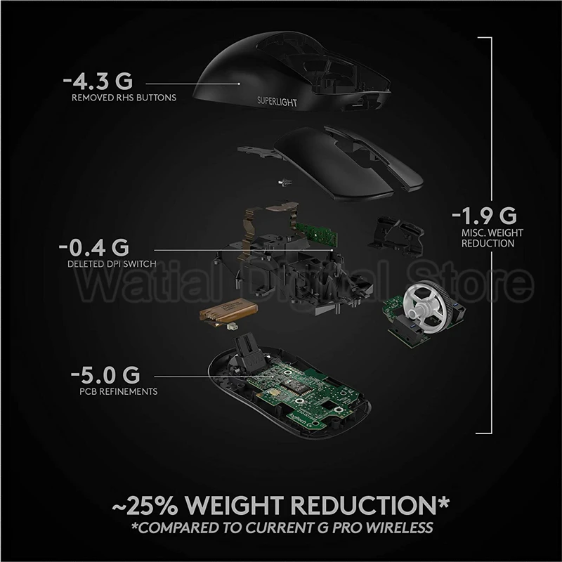 Сверхлегкий вес при весе до 63 граммов, гипер-минимальная перестройка обеспечивает снижение веса почти на 25% по сравнению со стандартной беспроводной мышью PRO.