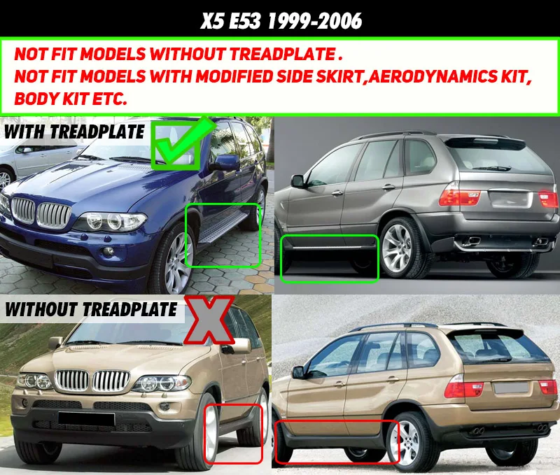 Фитинг: для BMW X5 E53 1999-2006Только для моделей с беговой доской.Не подходит для модели «M» или «Спортивная посылка» и без модели беговой доски (шаг двери)