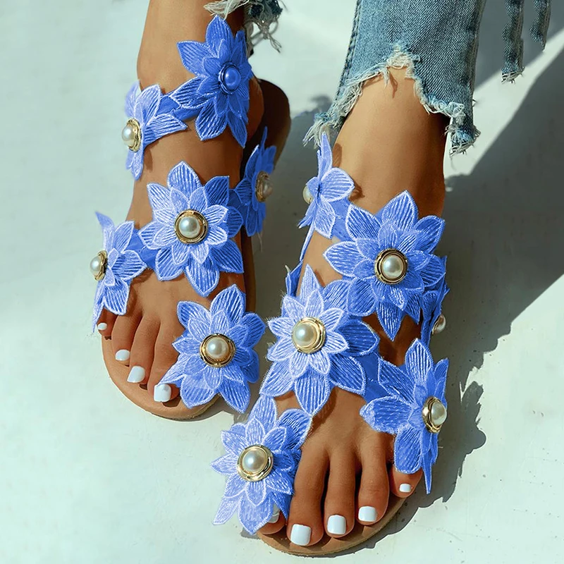 Сандалии женские кустарниковые, цветочный принт, жемчуг, плоская подошва, пляжная обувь с кольцами, красивые босоножки, летние сандалии