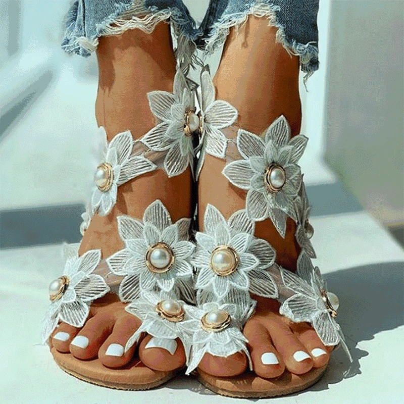 Женские босоножки ручной работы, летние женские цветочные босоножки на плоской подошве с жемчужинами, пляжная обувь с кольцами и носком под платье, милые сандалии, женские сандалии