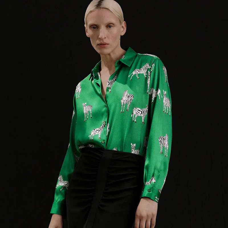 1. Особенности: длинный рукав, отложной воротник, принт, свободный крой.