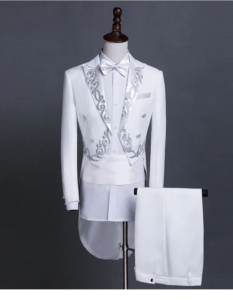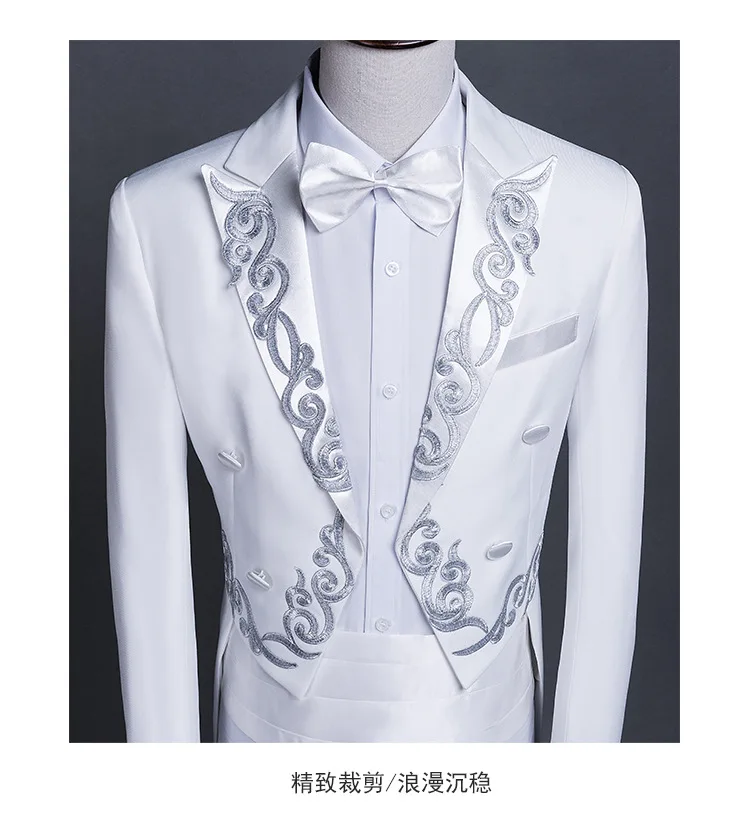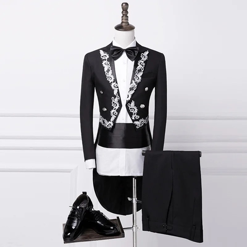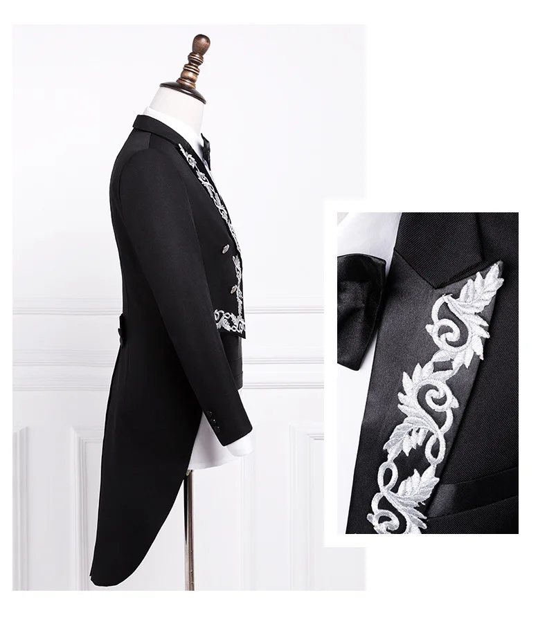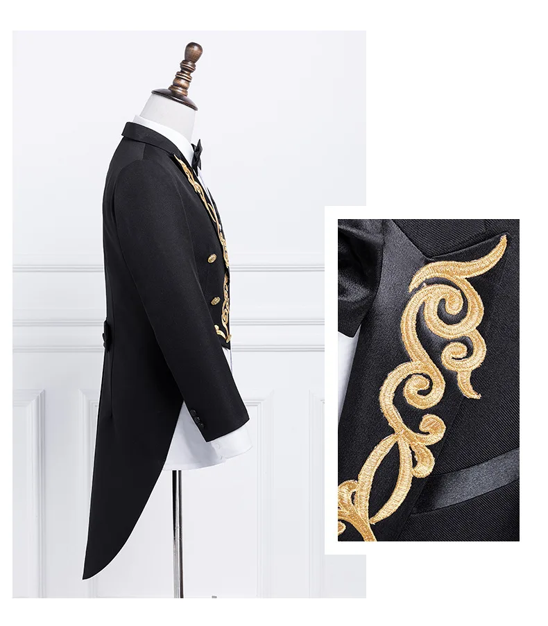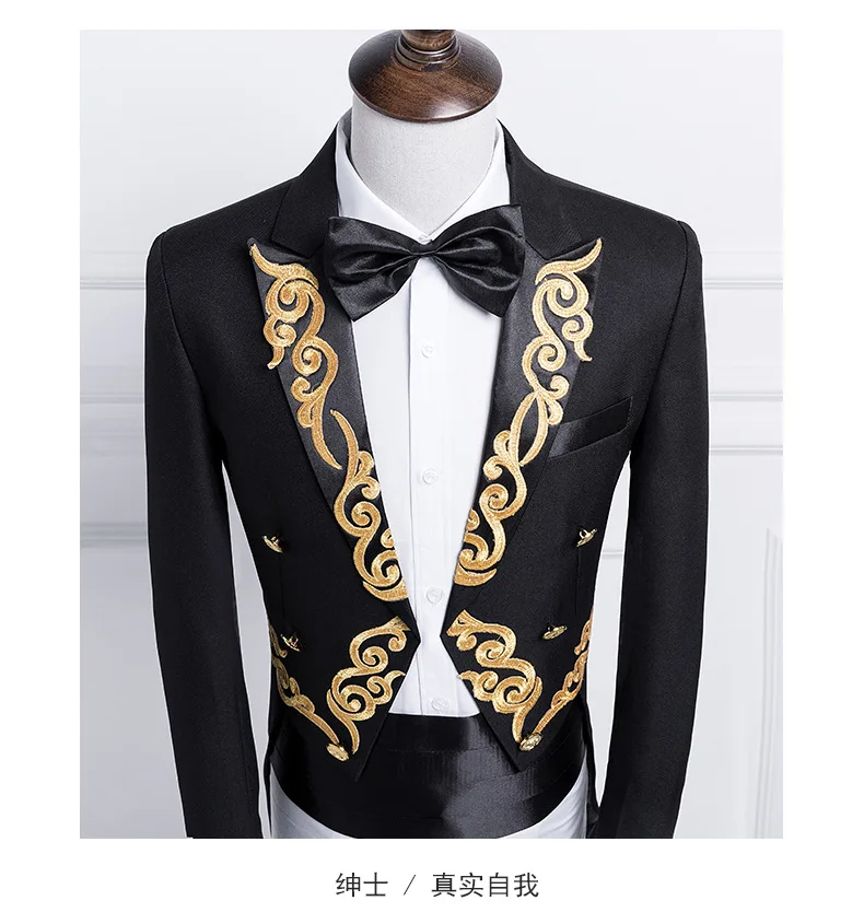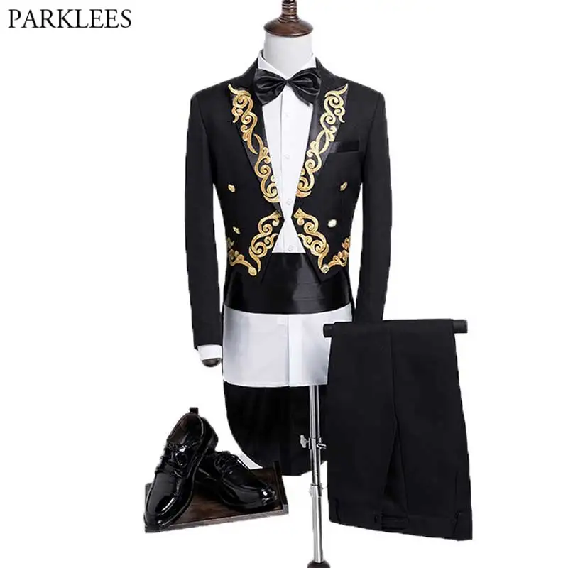 Мужской облегающий костюм с золотой цветочной вышивкой, 4 шт., мужской пианист, выпускной, свадебный ужин, ласточкин хвост, черный, смокинг, фрак