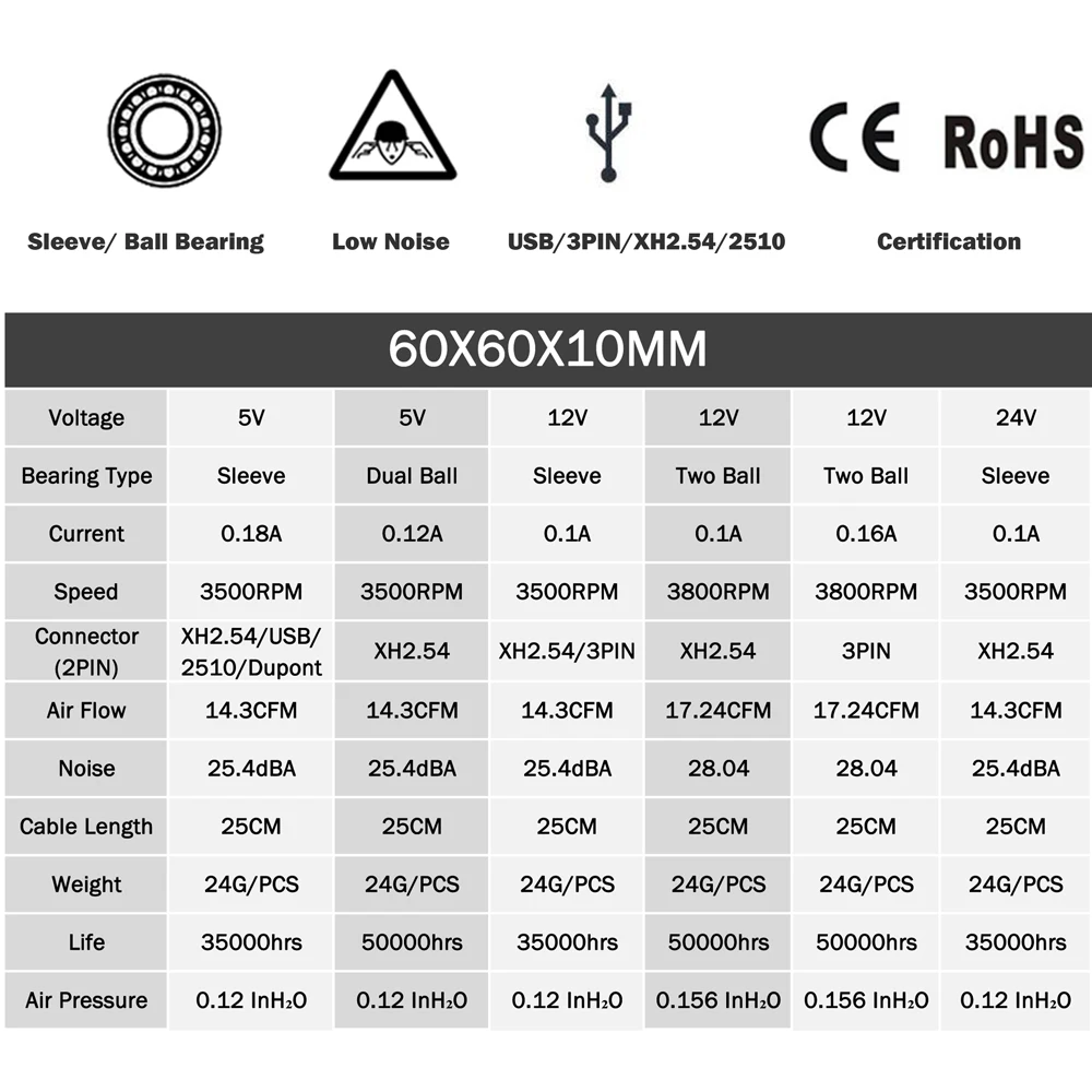 Вентилятор Gdstime, 6 см, 5 В, 12 В, 24 В, 6010, 60x60x10 мм, 60 мм