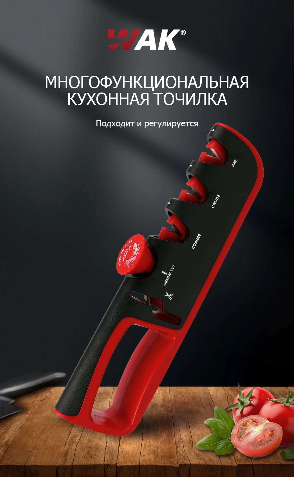 Точилка для ножей WAK 5 в 1, кухонный инструмент для заточки, регулируемый угол, черный, красный, профессиональный
