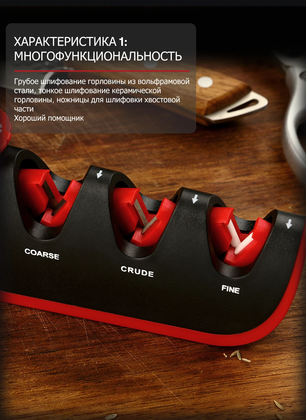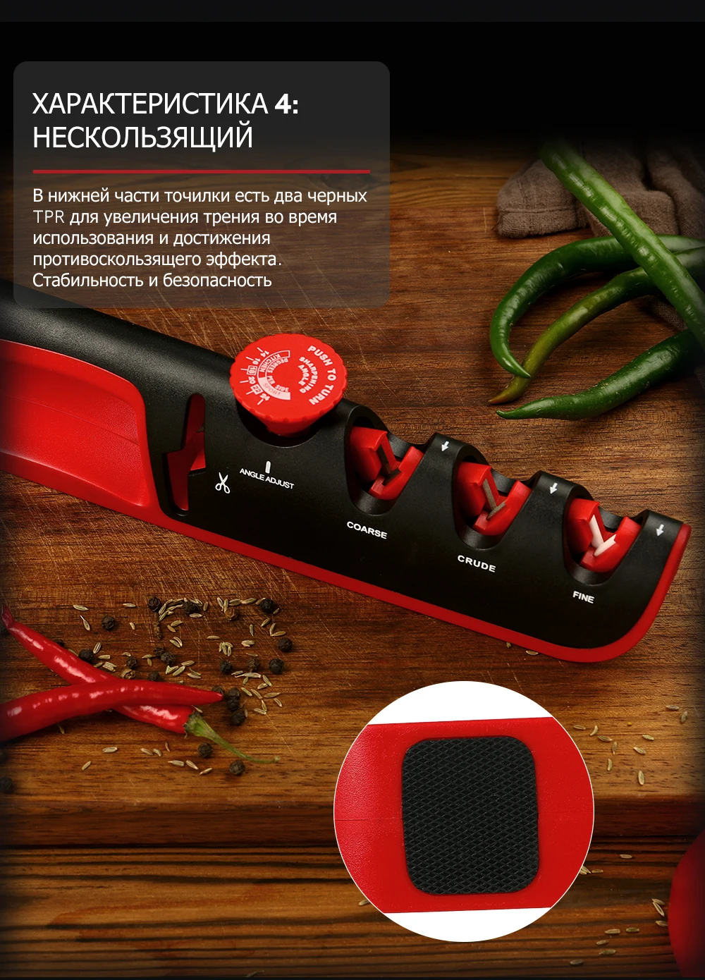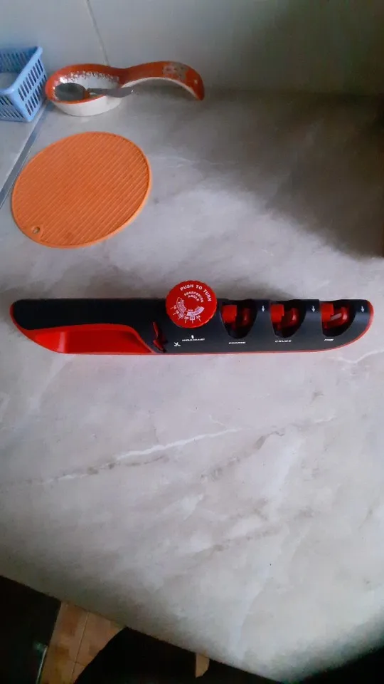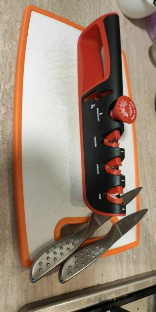 Не покупайте эту гадость! Вместо того, чтобы точить, она тупит и портит ножи! Внешне красивая , но абсолютно бесполезна игрушка. Не тратьте деньги на такое дерьмо!