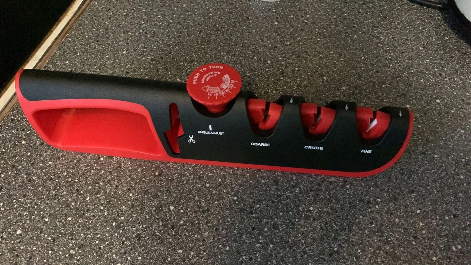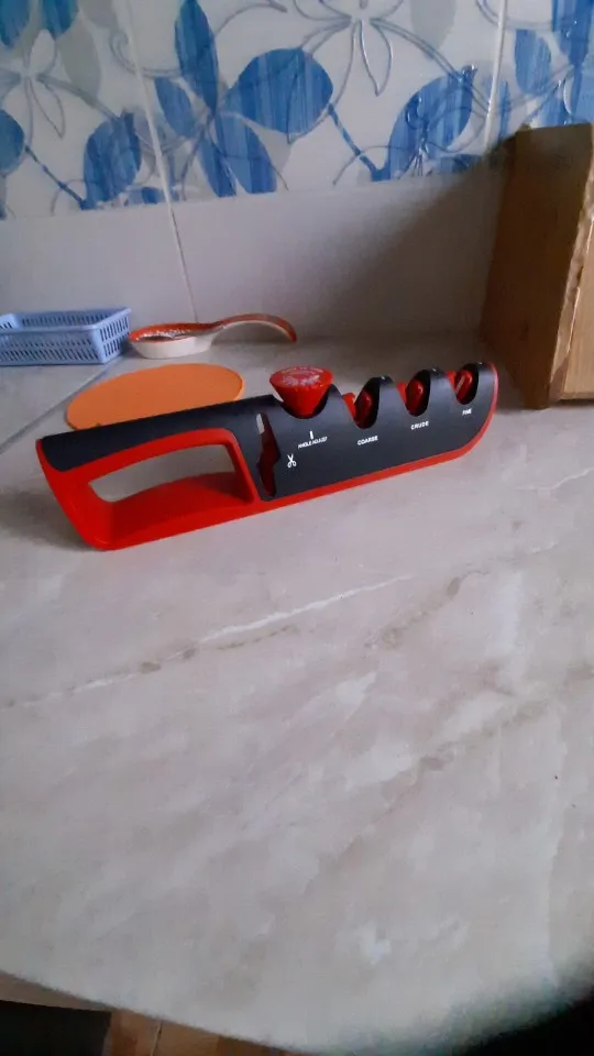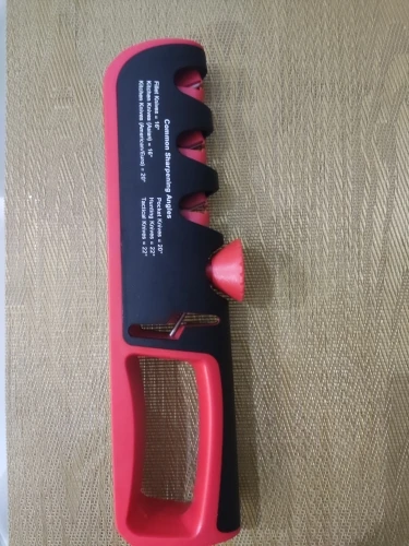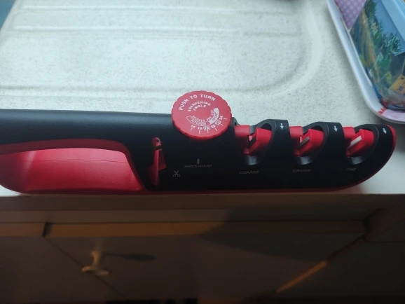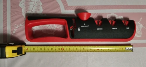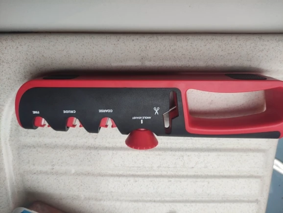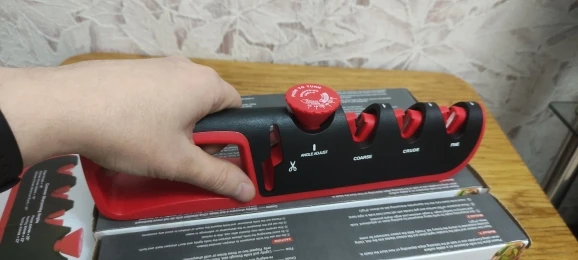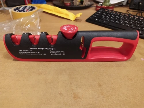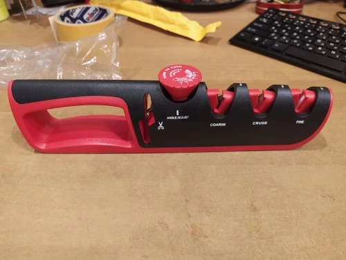 Отличная точилка. Заточил старый нож, проверил на ливерной колбасе, ровно режет и пленку и саму колбасу. Я очень доволен. 3*5 звезд.