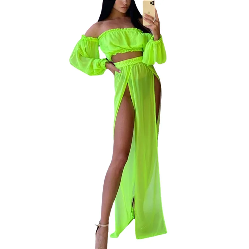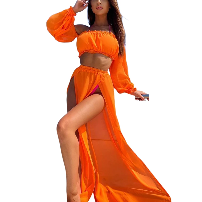 Женская пляжная одежда, топ с открытыми плечами и длинным рукавом, накидка, юбка, костюм из двух предметов, пляжная одежда для путешествий и отпуска, 2022