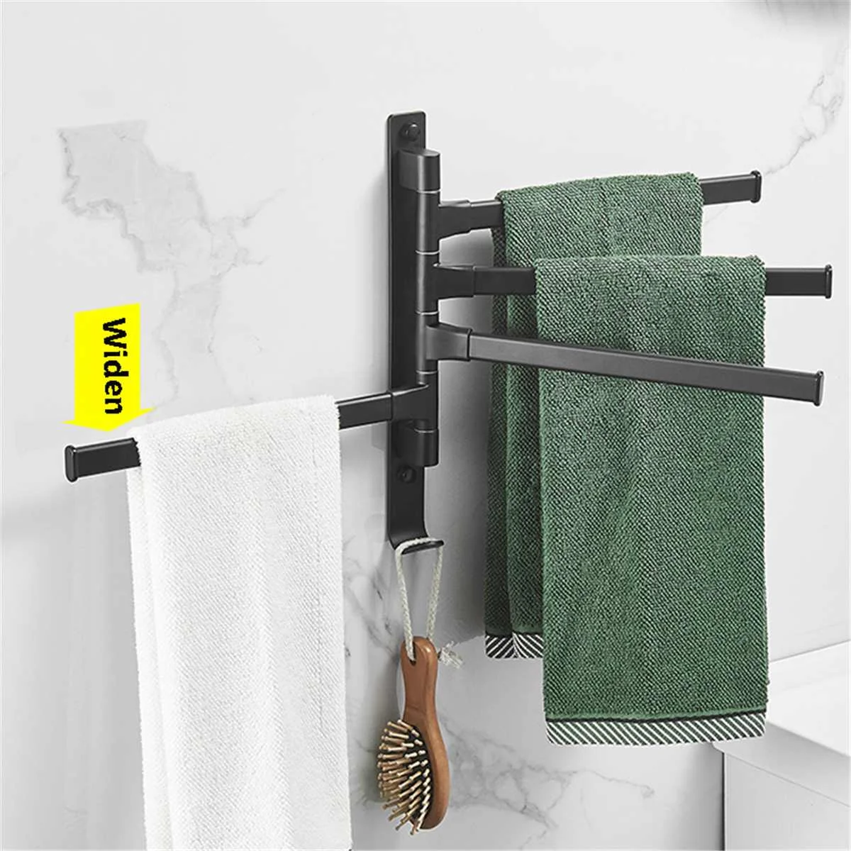 〖Features〗Идеальная вешалка для полотенец для вашей ванной комнаты.Настенный монтаж, экономия пространства.Вращающиеся стержни на 180 °, легко регулировать положение.Изготовлен из космического аллюминя, который является прочным и устойчивым.