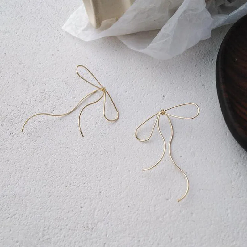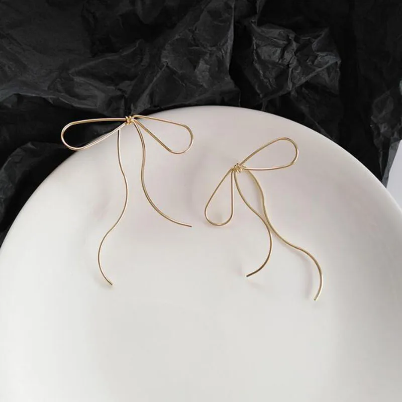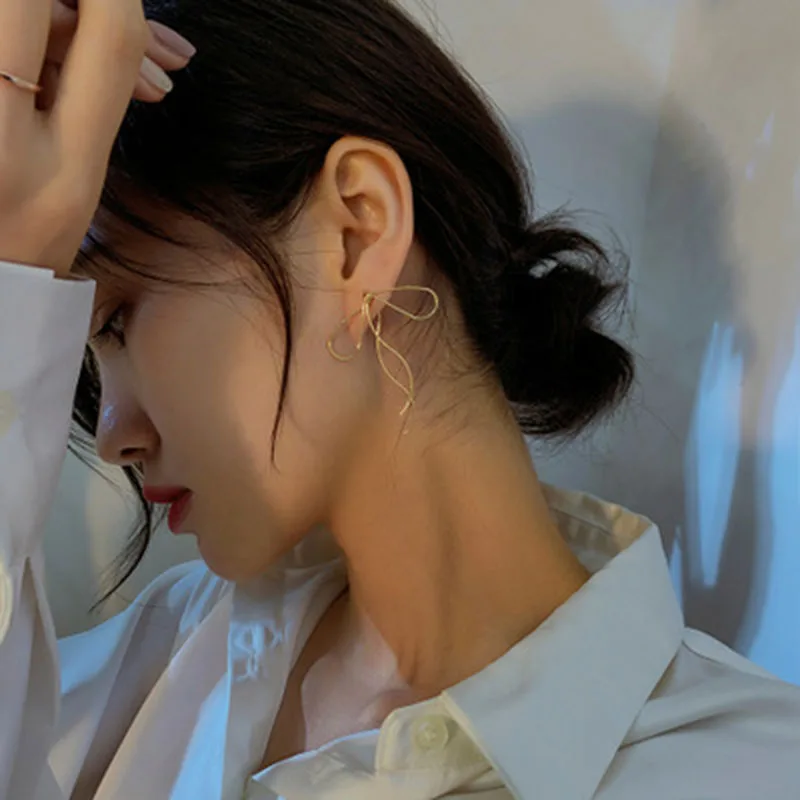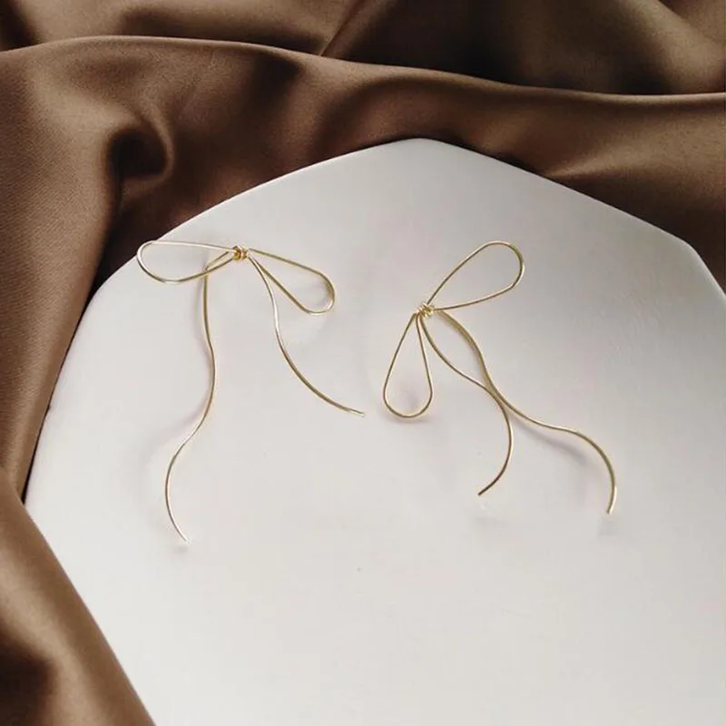 2021 корейский дизайн модные ювелирные изделия простой золотой цвет металлические линии серьги с бантом элегантные женские длинные висячие серьги