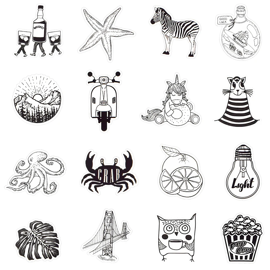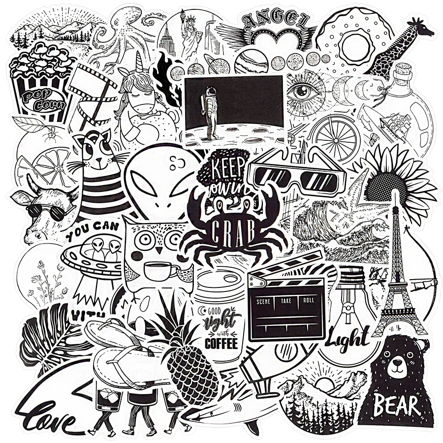 Посылка включает: 50 шт. черно-белых стильных наклеек Vsco. Не повторяется.