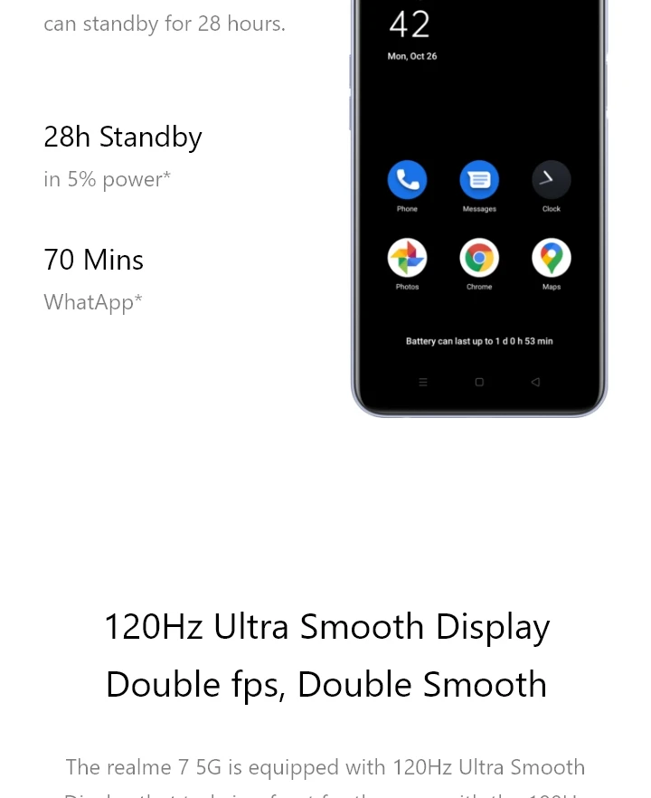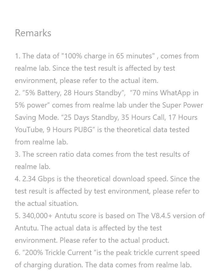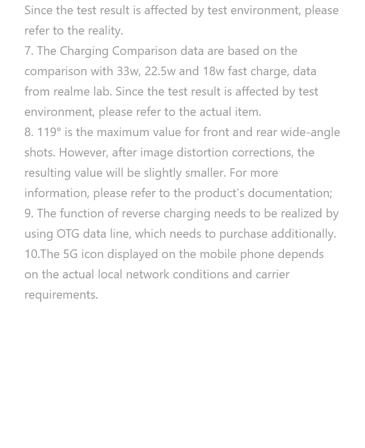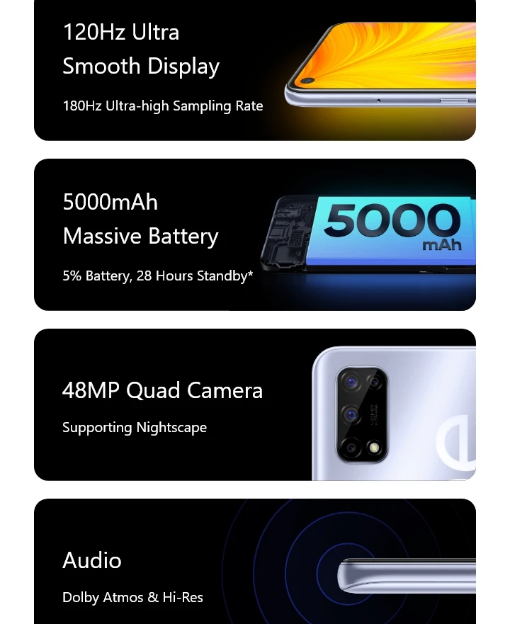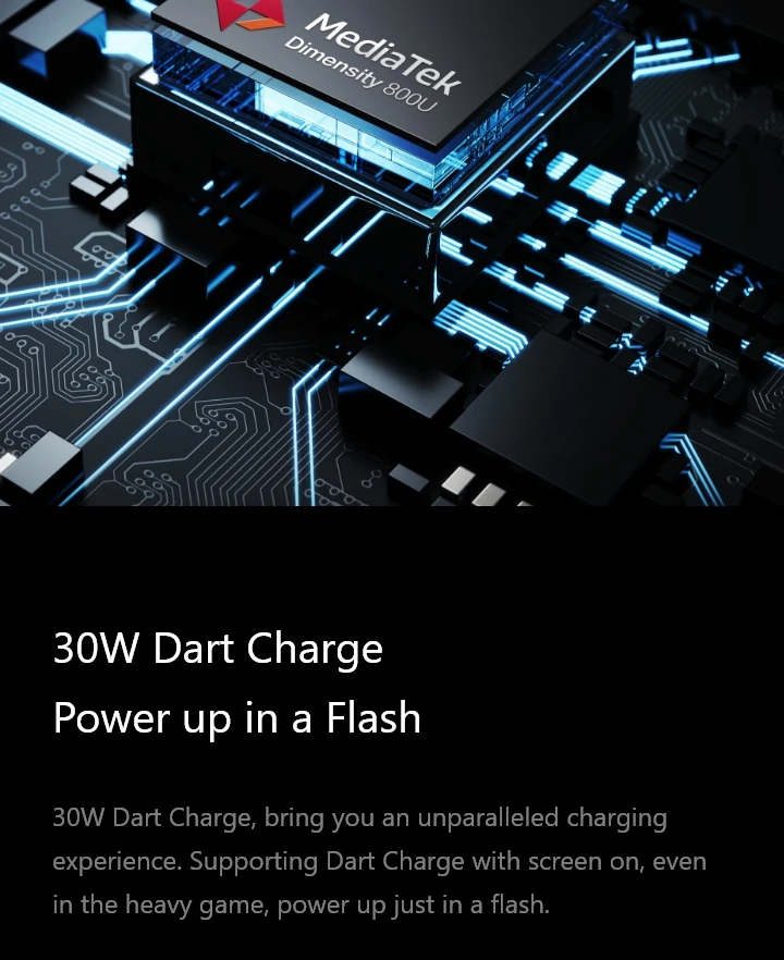 ПроцессорMTK Dimensity 800UОперативная память6 ГБВстроенная память128 ГБДисплей6,5 "2400x1080 ПолноэкранныйКамера48MP + 8MP + 2MP + 2MP (задний) 16MP (передний)Батарея5000 мАч (Typ.)Сетевое подключение2G GSM850/900/1800/19003G WCDMAВ1/5/84G FDD LTEПолосы 1/3/5/7/8/20/284G TD LTEПолосы 38/40/415G NRN1/3/5/7/8/20/28/38/40/41/77/78