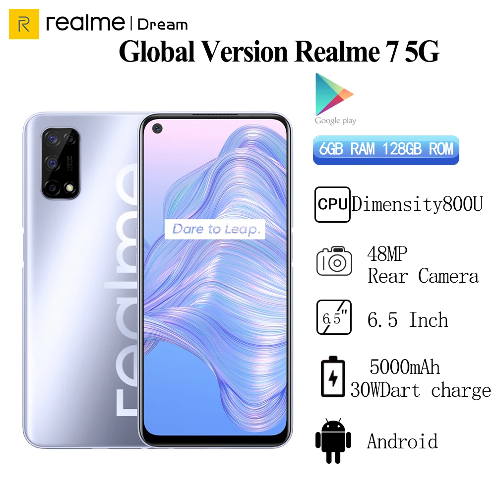 Realme 7 5G смартфон 6 ГБ 128 ГБ глобальная версия Dimensity 800U 120 Гц Дисплей 48MP Камера 5000 мАч, 30W Дротика зарядки сотовых телефонов