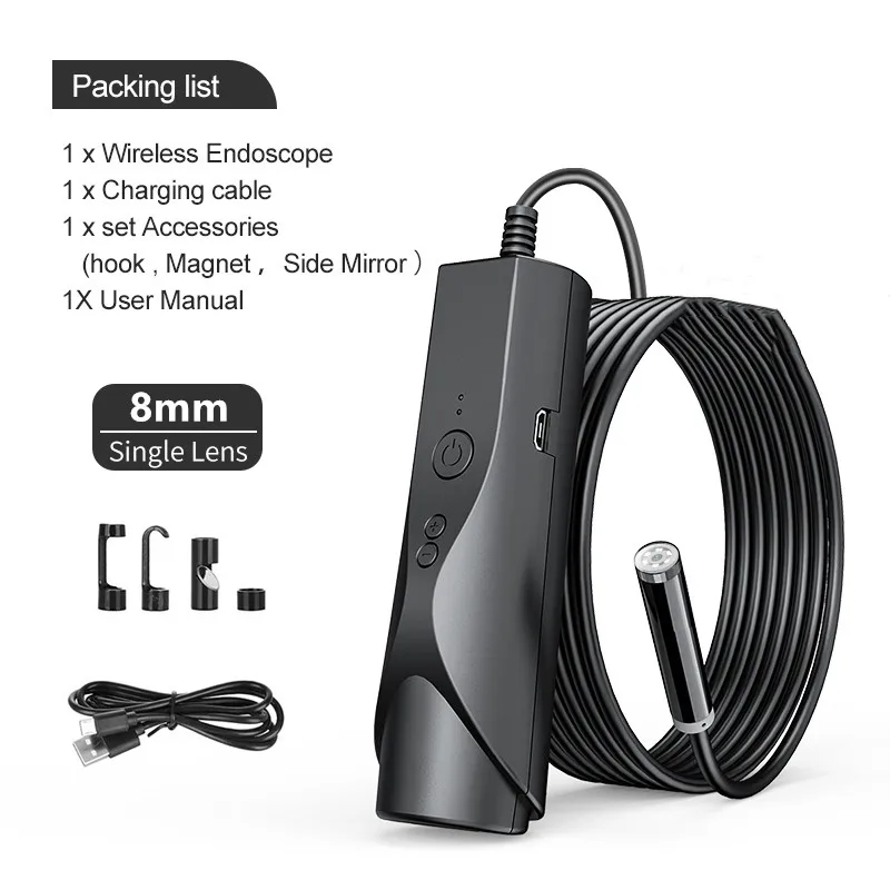 Эндоскопическая камера 1x8 мм1x USB кабель для зарядки1 небольшой крючок1x магнит1x Руководство пользователя
